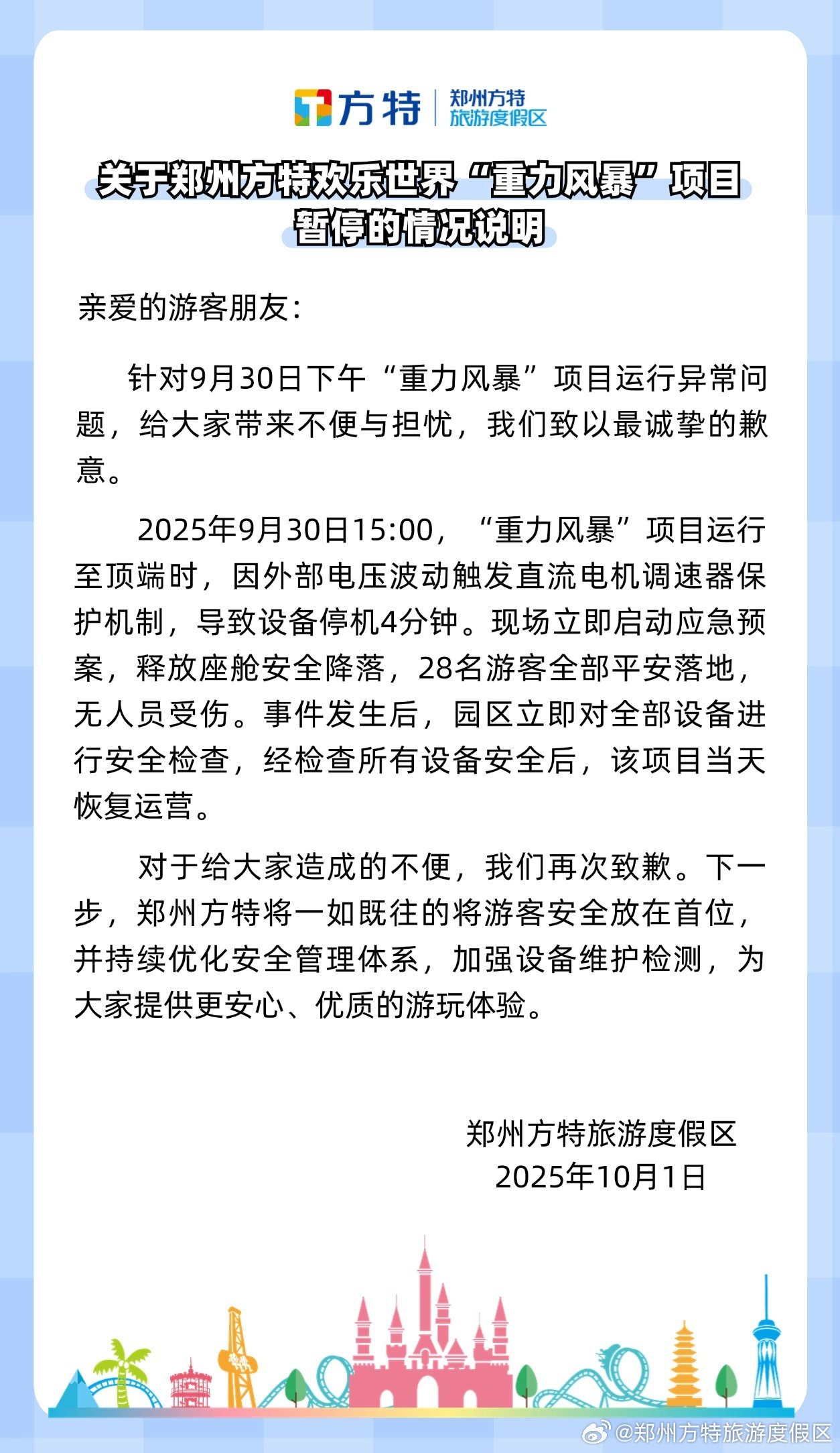 【#郑州方特发文致歉#】10月1日,发布关于郑州方特欢乐世界“重力风暴”项目暂停的情况说明↓ #郑州方特跳楼机高空悬停#