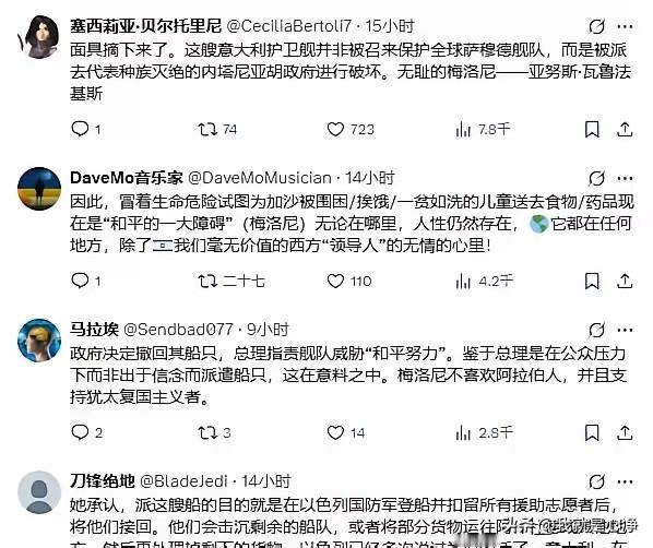 原来意大利是内奸啊。梅洛尼的真实目的并不是为了保护坚韧船队,她只是为了给以色列海军当内应。 现在外网已经炒成一团,梅洛尼已经公开地表示,坚韧船队必须立刻停止。 所有人都必须接受以色列和美国拟定的安全机制。 一切救援都必须按照以色列的规则来。 她这样的言论已经实锤了。 意大利的战舰并不是沿途去保护的。 他只是帮助以色列的海军,沿途监督而已。 等到以色列的海军强行登船之后,意大利负责把这些国际救援人士送走。 然后以色列就会把剩下的船只拖走或者直接炸掉。 从这一点我们就已经可以证明了,梅洛尼就是犹太资本扶持起来的一个傀儡或者说棋子!