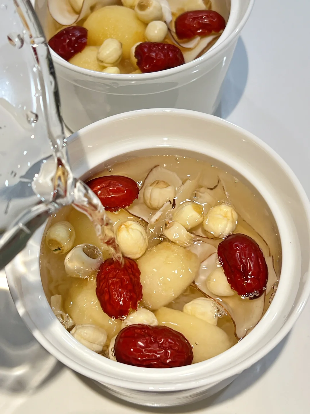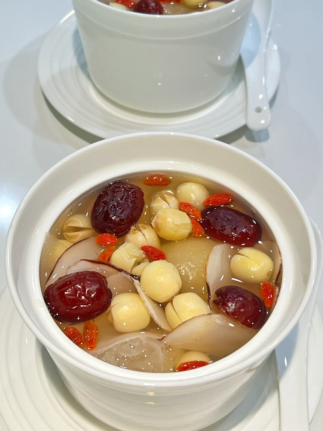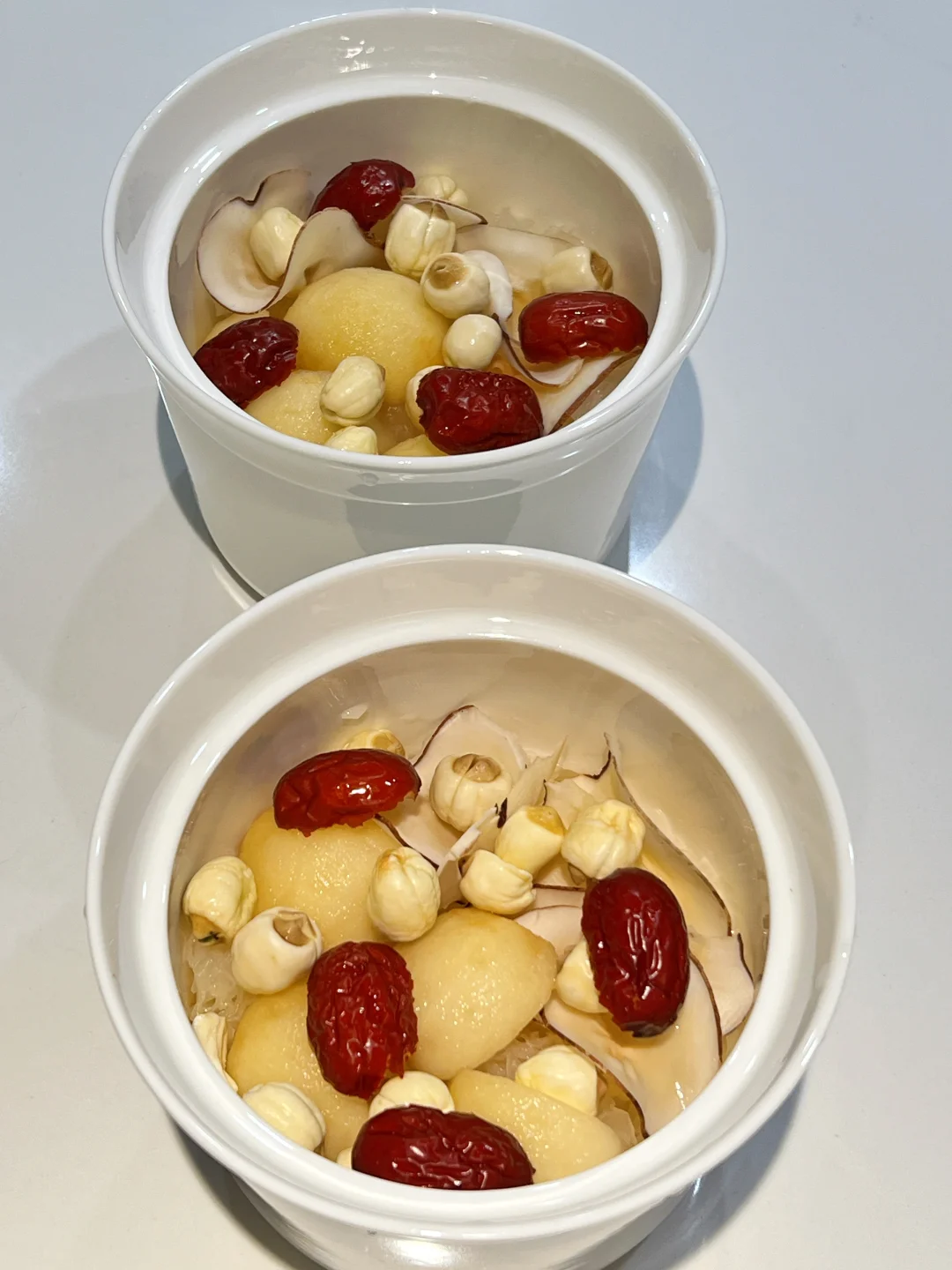 又到了枇杷的季节,今天用当季的白枇杷搭配银耳,莲子,海底椰做一道滋阴润燥,非常适合夏天饮用的羹汤~尤其适合经常吹空调,喉咙干痒,皮肤干燥的你们~ 🧑🍳食材: 1️⃣枇杷4个 2️⃣银耳半朵 3️⃣莲子10g 4️⃣海底椰5g 5️⃣去核红枣4个 6️⃣枸杞适量 🥣做法: 1️⃣银耳切碎,枇杷去核备用。 2️⃣将所有食材放进炖盅,加清水至9分满,炖一小时后加枸杞即可。 ❗️小贴士: 1️⃣红枣核燥热,去核再用。 2️⃣喜欢甜的可以加少许冰糖一起炖。
