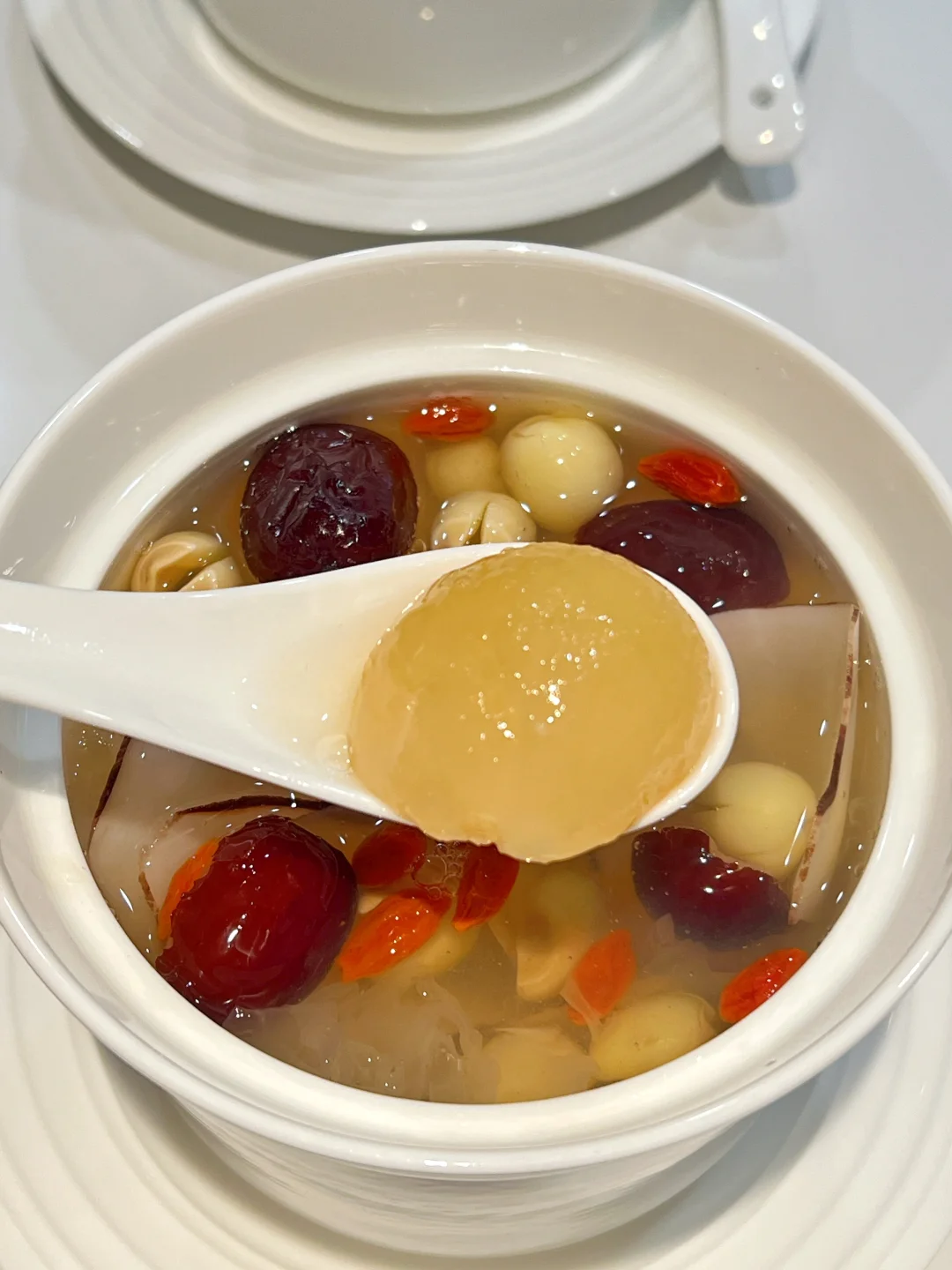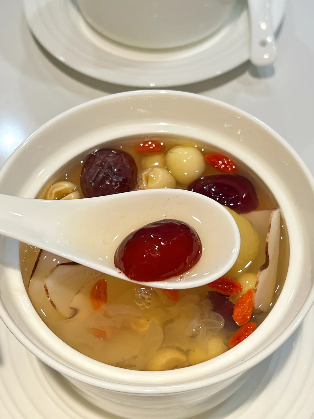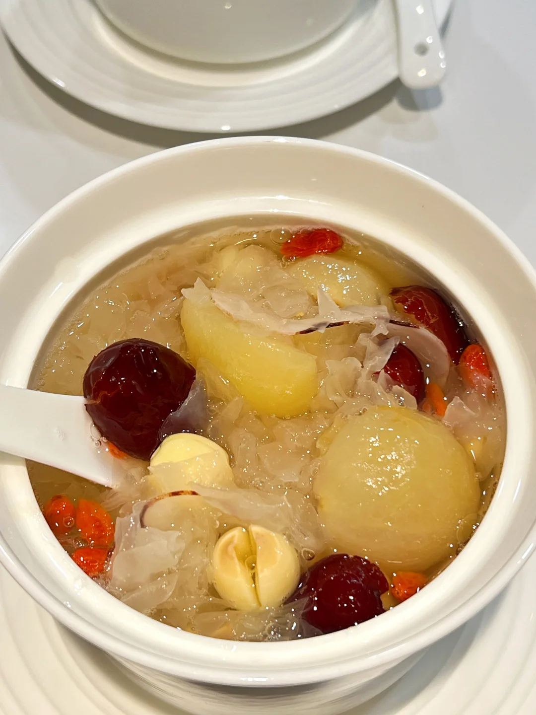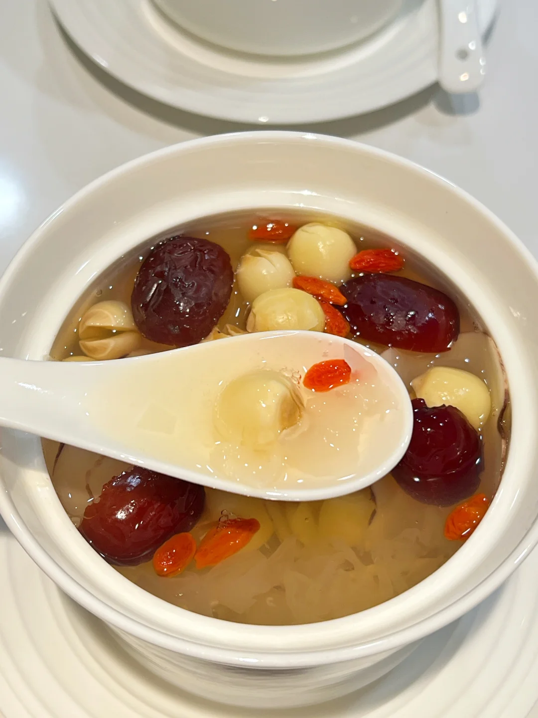 又到了枇杷的季节,今天用当季的白枇杷搭配银耳,莲子,海底椰做一道滋阴润燥,非常适合夏天饮用的羹汤~尤其适合经常吹空调,喉咙干痒,皮肤干燥的你们~ 🧑🍳食材: 1️⃣枇杷4个 2️⃣银耳半朵 3️⃣莲子10g 4️⃣海底椰5g 5️⃣去核红枣4个 6️⃣枸杞适量 🥣做法: 1️⃣银耳切碎,枇杷去核备用。 2️⃣将所有食材放进炖盅,加清水至9分满,炖一小时后加枸杞即可。 ❗️小贴士: 1️⃣红枣核燥热,去核再用。 2️⃣喜欢甜的可以加少许冰糖一起炖。