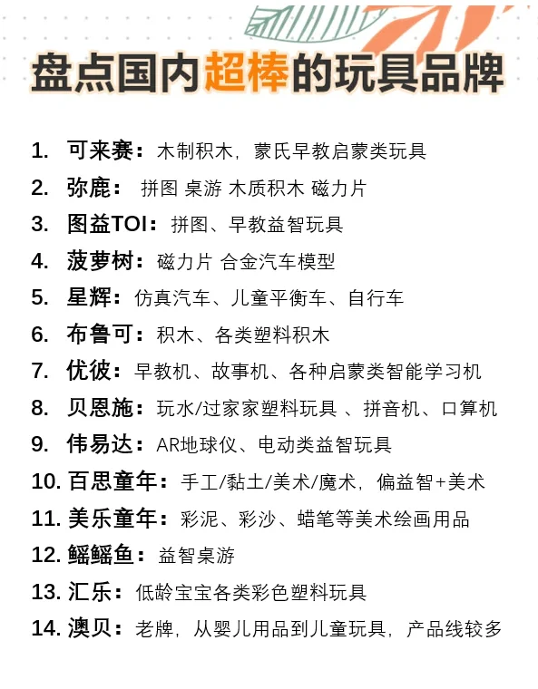 这次盘点了品质比较不错的一些国产玩具品牌,基本上想要的相应的玩具品类,到他们家闭眼入不会错。