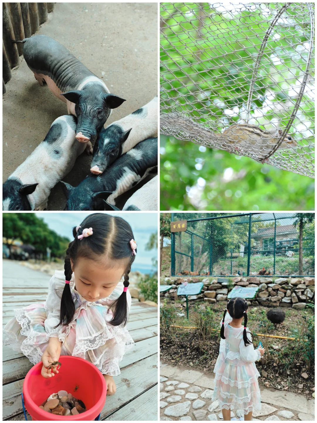 从观景台下来往前走,发现了一个小型萌宠乐园,好多只小松鼠、孔雀、公鸡母鸡、小香猪,小丸子认真的投喂它们,真的开心得很。