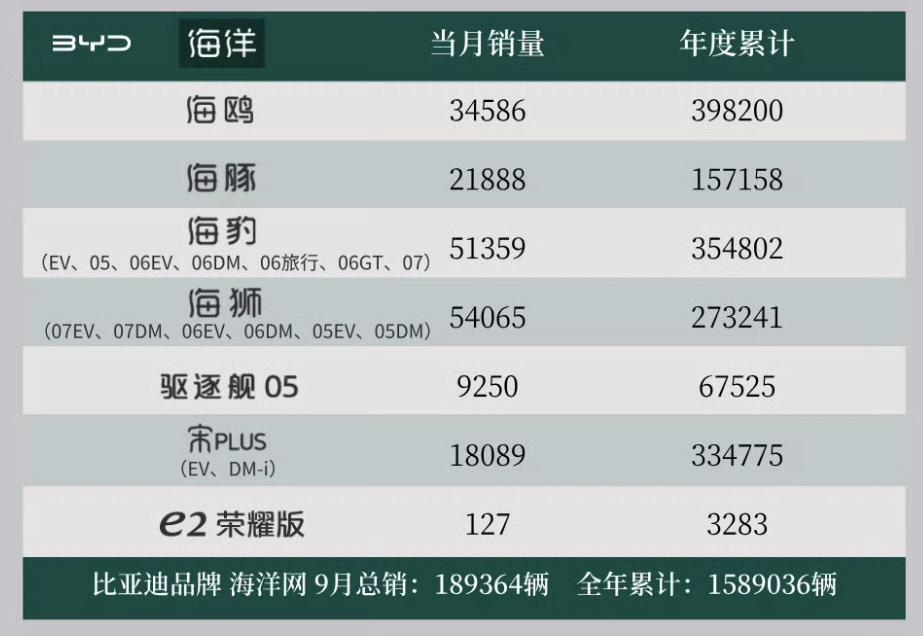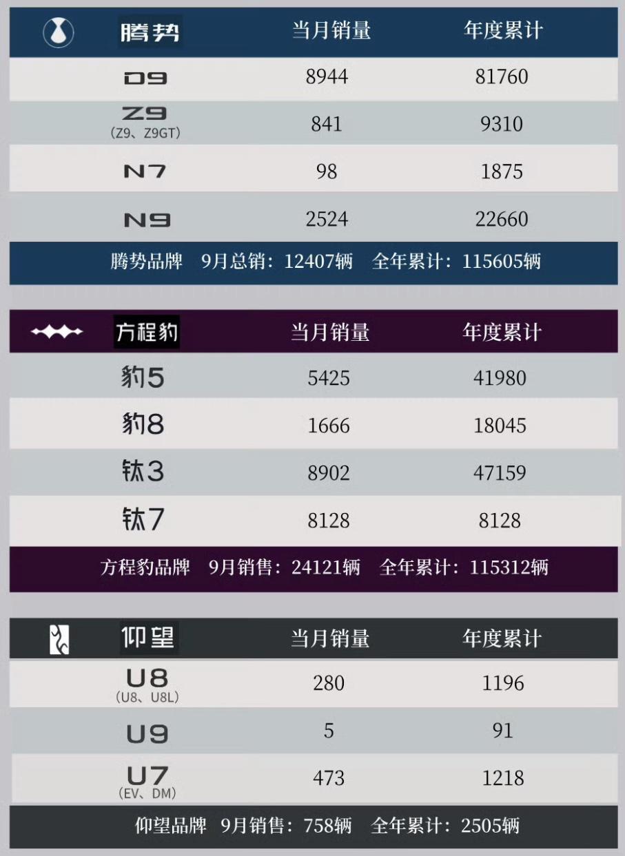 比亚迪9月乘用车总销超39万辆,其中EV销量20万+,DM为18.8万多辆,一起来看9月销量明细。 王朝网:162651辆 秦家族67577辆 元家族45291辆 宋家族24089辆 唐家族13620辆 其余车型未过万,比较可惜的是汉(8690辆),颜值和产品力都很在线的一款车。 海洋网:189364辆 海狮海豹双顶流,月销均破5万辆 海鸥34586辆 海豚21888辆 宋plus18089辆 驱逐舰05 9250辆 e2荣耀版127辆 来看高端组方程豹、腾势和仰望 方程豹:24121辆 钛3/钛7均为8000+,两款车主打性价比,赢得极大的关注 豹5 5425辆 豹8 1666辆 腾势:12407辆 D9 8944辆、N9 2624辆 D9还是很稳定。 仰望:758辆 U7 473辆、U8 280辆、U9 5辆【来自懂车帝车友圈】