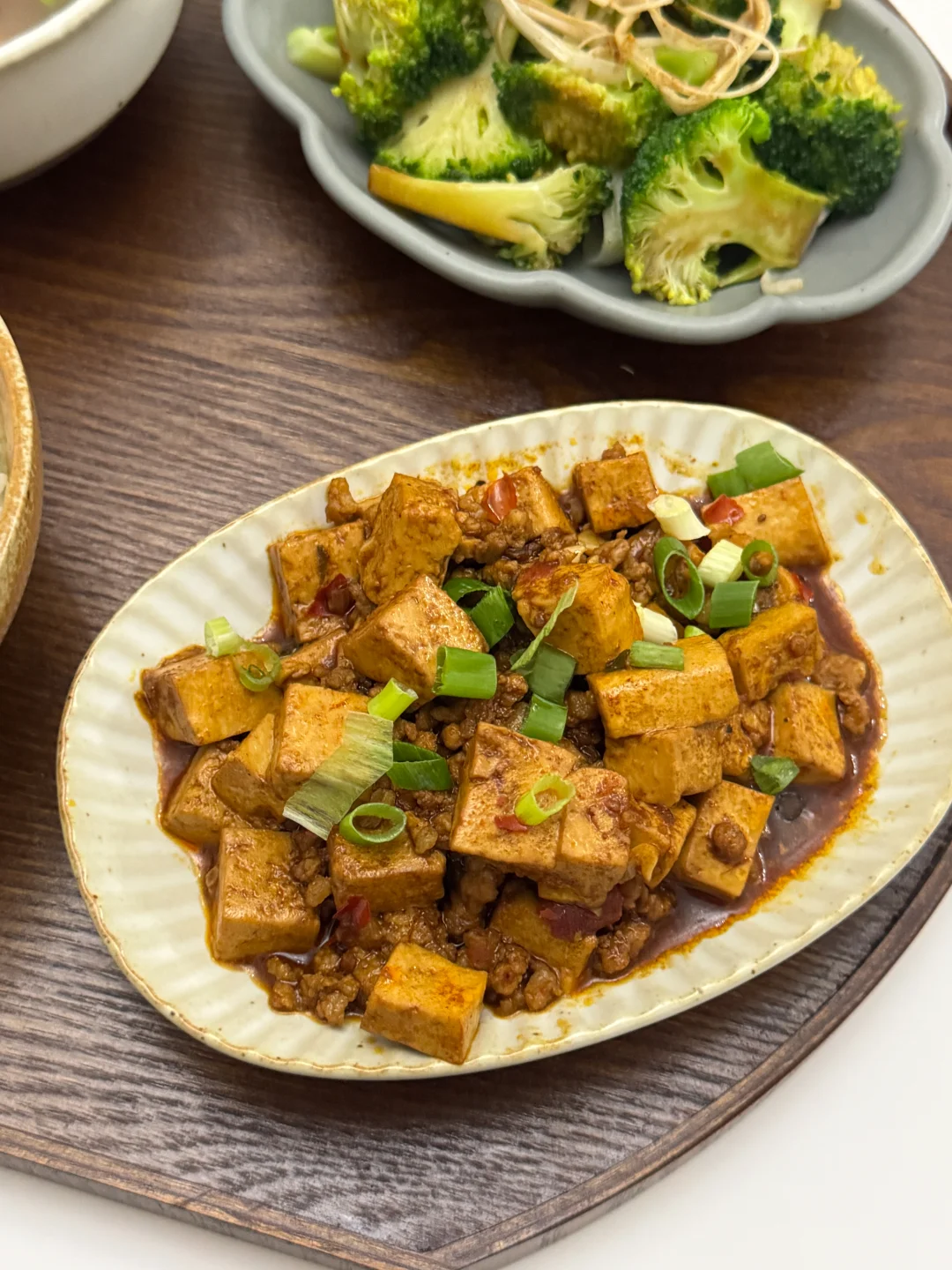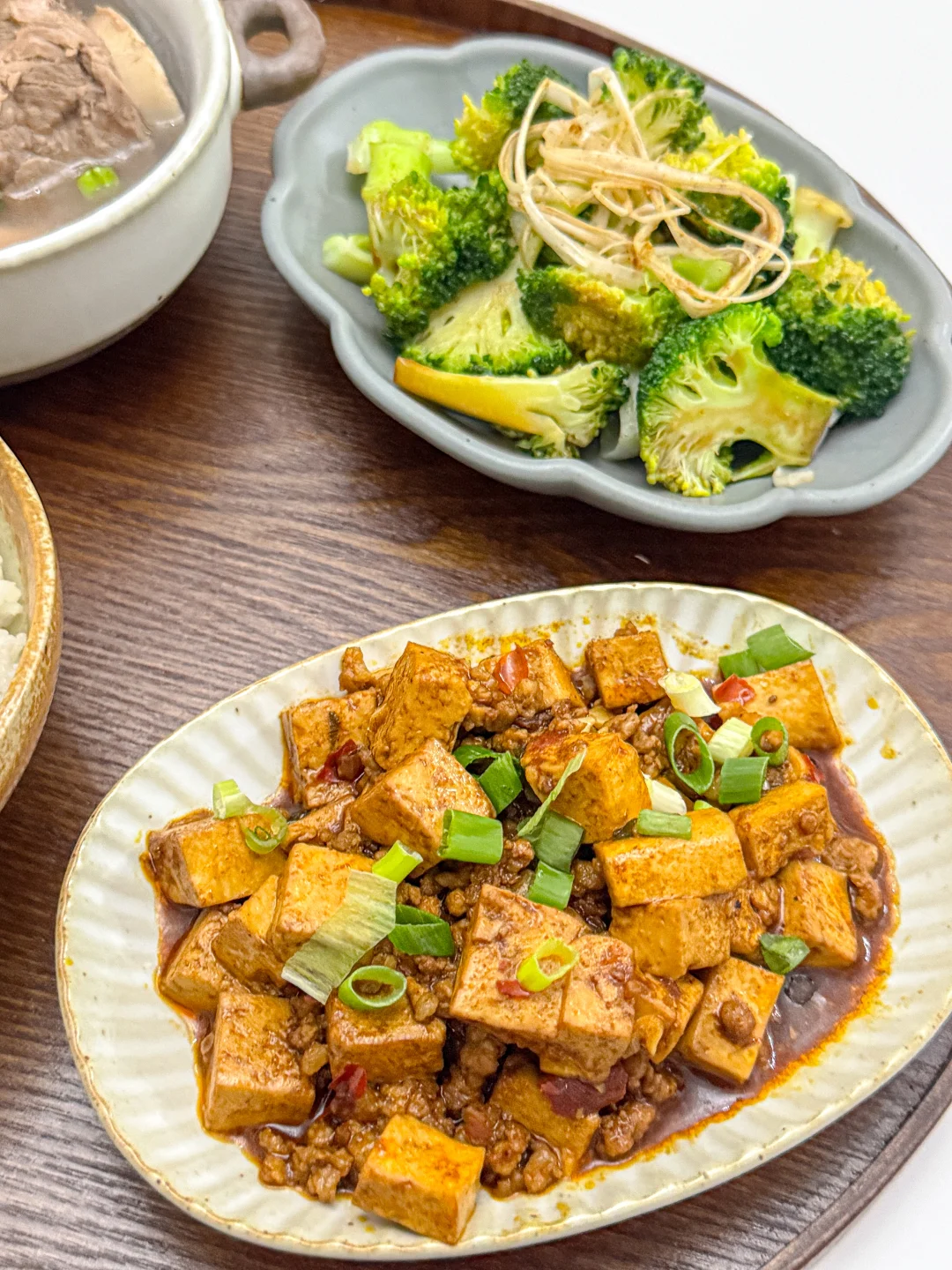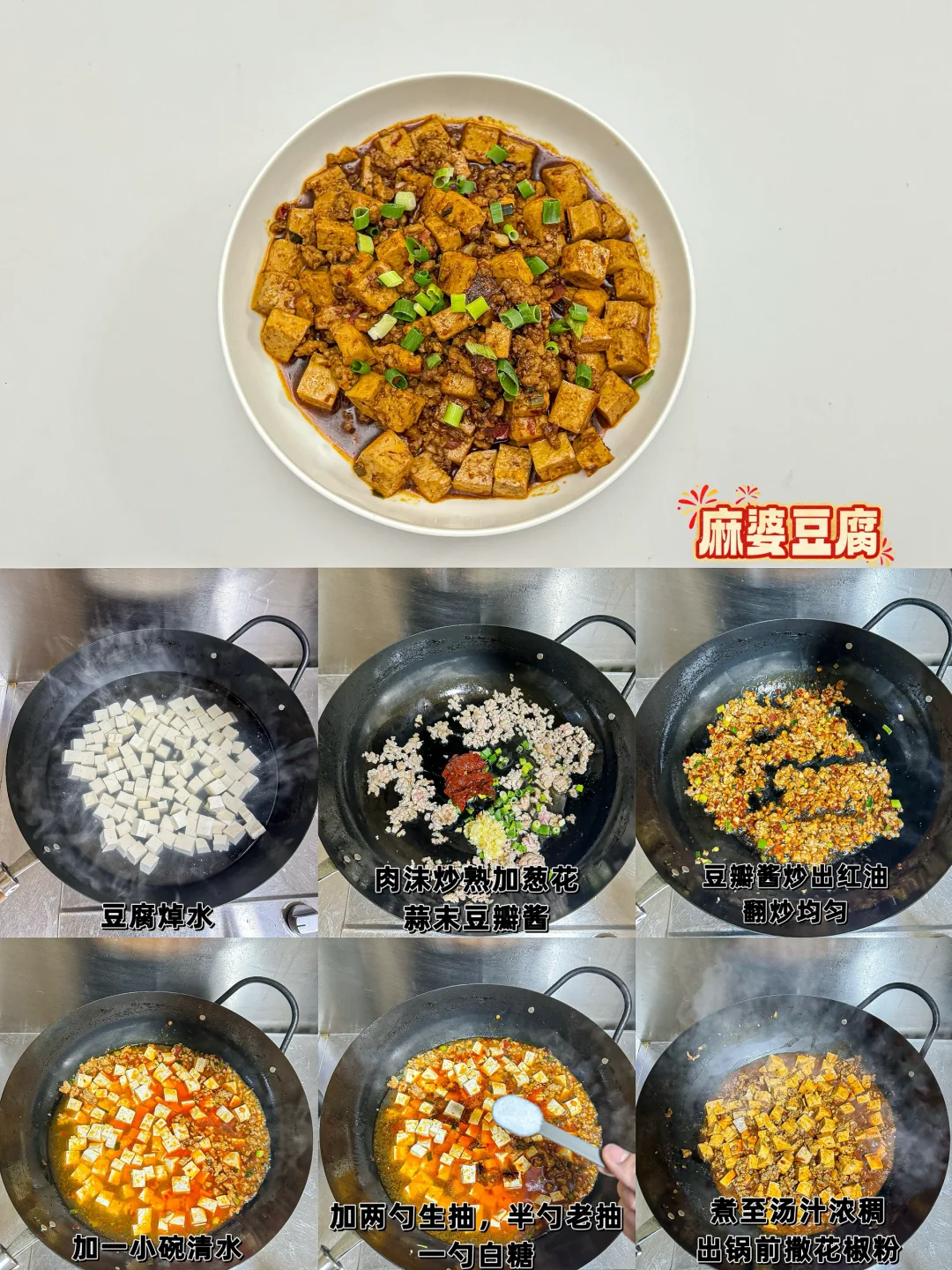 1️⃣ 老豆腐切块焯水去腥,肉末炒香加葱蒜末