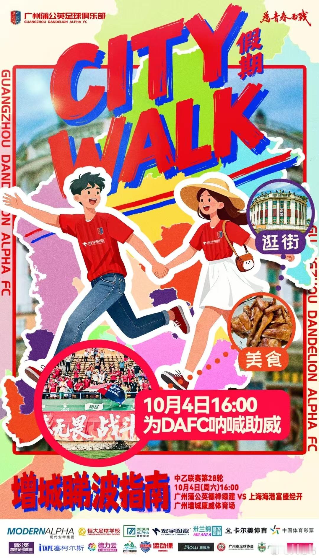 【海报寓意】正值国庆佳节,大家出游了没?city walk.了没?畅游广州,逛街品尝美食之际,不要忘了10.4到增城看主场比赛哦,寓教于乐,体教结合,才是正道……海报彰显了假期游玩氛围,颜色鲜艳,让人心情愉悦[手指比心]鸣聊体育中乙联赛