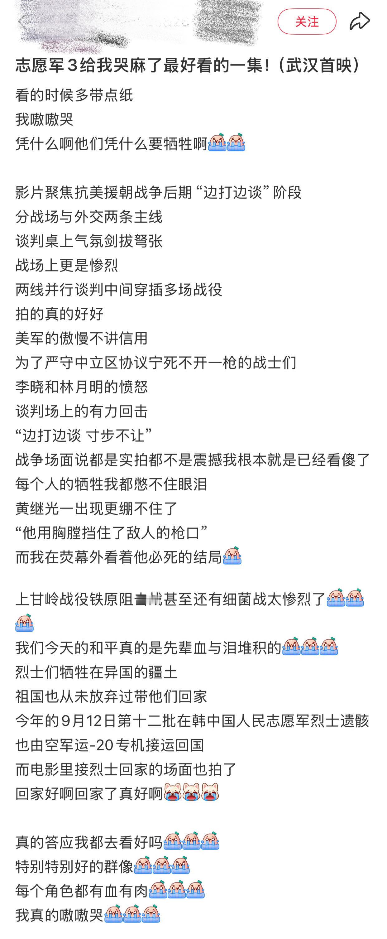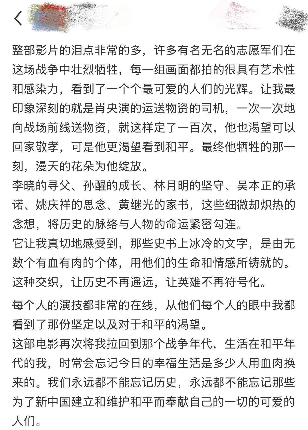 刀我别用亲情刀,可《志愿军:浴血和平》后告片又刀我一次!从初次团圆被打断,到战场上的匆匆一见,李家三口总是聚少离多。父亲李默尹将寄托着“家”的念想的钥匙留在水壶里后战死沙场,哥哥李想给妹妹李晓留下的“胜利了就回家”的承诺也没能兑现。出征前李想最先离开家,家里的两把钥匙,父亲带到战场一把,留给了李晓一把,最后战场上那把钥匙一定是爸爸留给李想的😢。那个说着“哥走了,爸也走了,这还算什么家”的李晓,最终对着空屋与遗照哽咽:“你们都回家了,真好”。怪不得每个看完电影的repo都会哭到绷不住,国庆档码住必看。