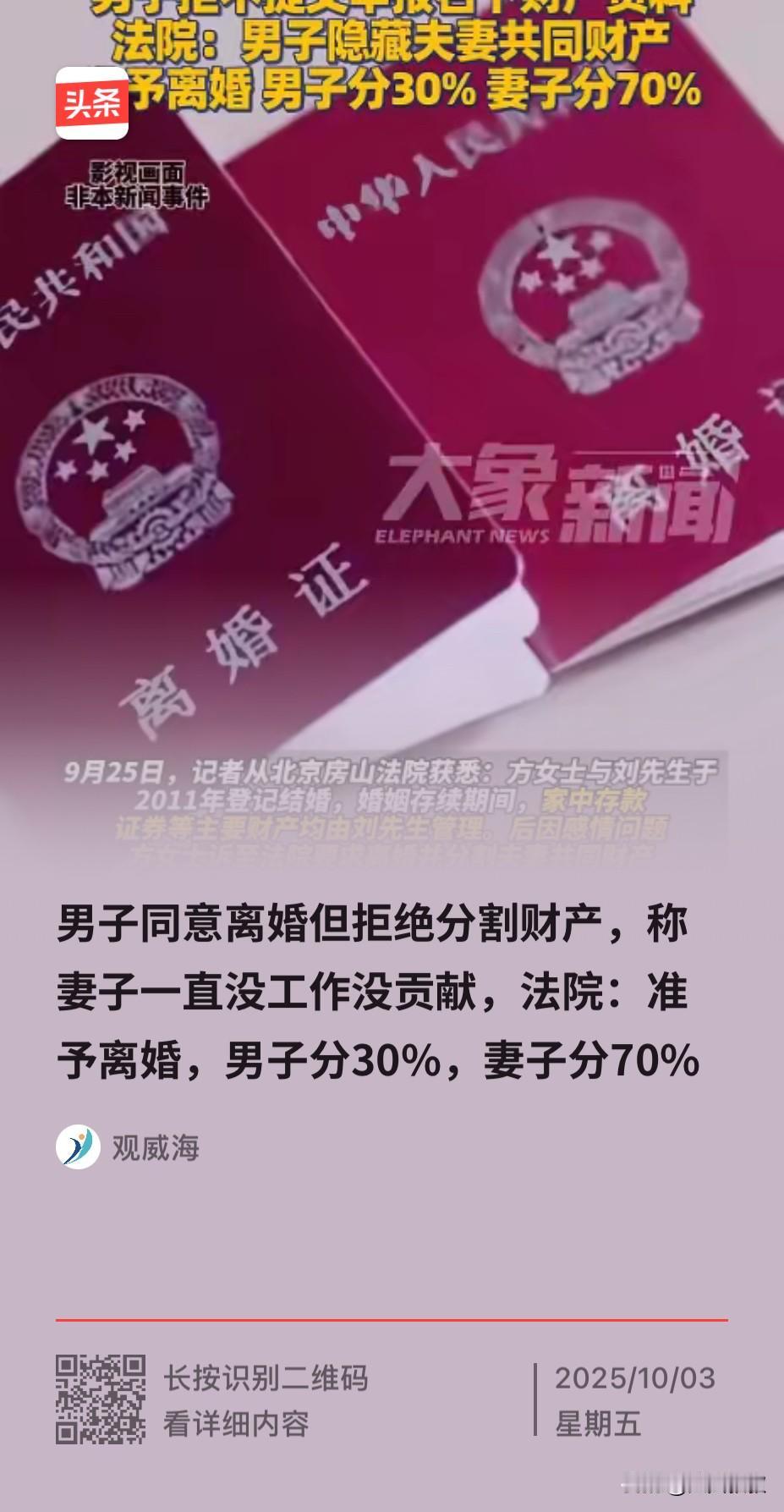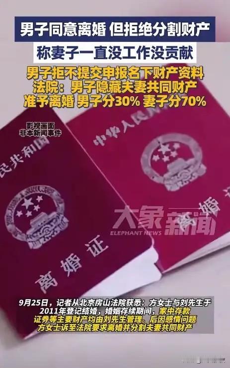 北京,男子和妻子结婚后,妻子就做起了全职太太,几年后,两人因为感情问题闹起了离婚,妻子起诉要求离婚并分割共同财产,然而,男子却认为这些钱都是自己挣的,妻子一直没工作也没有贡献,不应该分。最后法院的判决让人很意外。 据悉,方女士和刘先生是在2011年结的婚,结婚后,刘先生就管理起了家庭主要财产,后来因为感情问题,两人闹起了离婚。 方女士选择了向法院起诉,要求离婚并要求分割共同财产,可是,刘先生却认为,因为方女士结婚之后没有工作,家里的财产都是自己挣来的,所以,方女士对家庭财产积累没有任何的贡献,不应该分财产。 因为刘先生管理着家庭的主要财产,所以,法院要求双方申报明显财产,可是刘先生对此却很抵触,拒绝申报明显的财产。 那么,在刘先生拒绝申报的情况下,法院会怎么判? 有人就认为,虽然她没工作,但是她跟你一样撑起了这个家,她把家庭照顾好了,你才能在外边工作,她尽到了一个妻子的责任,她就应该分! 还有人说,我媳妇收入不到我的一半,但是工作原因我很难照顾家里,家里俩娃大部分时间靠我媳妇带,我负责把钱挣回家。我在家的时候也尽量做家务减轻媳妇负担。婚姻的经营要靠双方共同努力,经济上的多寡只是其中一方面,带娃家务啥的我觉得比上班累多了。 第一,全职太太的“家务劳动”,其实是具有财产价值的“家庭贡献”,有权分割共同财产。 民法典婚姻家庭编的解释(二)第二十一条规定,离婚诉讼中,夫妻一方有证据证明在婚姻关系存续期间因抚育子女、照料老年人、协助另一方工作等负担较多义务,依据民法典第一千零八十八条规定请求另一方给予补偿的,人民法院可以综合考虑负担相应义务投入的时间、精力和对双方的影响以及给付方负担能力、当地居民人均可支配收入等因素,确定补偿数额。 所以,刘先生主张“方女士无工作即无贡献”,是没有法律依据的。 第二,婚后收入原则上均属夫妻共同财产,与“是否工作”无直接关联。 《民法典》第一千零六十二条规定:“夫妻在婚姻关系存续期间所得的下列财产,为夫妻的共同财产,归夫妻共同所有:(一)工资、奖金、劳务报酬;(二)生产、经营、投资的收益;(三)知识产权的收益;(四)继承或者受赠的财产,但是本法第一千零六十三条第三项规定的除外;(五)其他应当归共同所有的财产。夫妻对共同财产,有平等的处理权。” 本案中,刘先生在婚姻关系存续期间获得的工资、奖金、投资收益等,均属于法定的夫妻共同财产。虽然方女士放弃工作照料家庭,客观上为刘先生专注事业、创造财富提供了必要支持,若无人处理家务、照顾家人,刘先生难以全身心投入工作,其财产积累必然会受影响。因此,刘先生主张“财产均为个人所得”,忽视了方女士的隐性贡献。 第三,刘先生拒绝申报财产,实际上构成“隐匿财产”,需承担少分或不分财产的法律后果 《民法典》第一千零九十二条规定:“夫妻一方隐藏、转移、变卖、毁损、挥霍夫妻共同财产,或者伪造夫妻共同债务企图侵占另一方财产的,在离婚分割夫妻共同财产时,对该方可以少分或者不分。离婚后,另一方发现有上述行为的,可以向人民法院提起诉讼,请求再次分割夫妻共同财产。” 实践中,“隐匿财产”的认定并不局限于“积极转移、变卖财产”,还包括“消极拒绝披露财产信息”——尤其是在一方实际控制家庭财产(如本案中刘先生管理主要财产)的情况下,其负有向法院如实申报财产的法定义务。若其无正当理由拒绝申报,导致法院无法查明全部共同财产,即属于“以不作为方式隐藏夫妻共同财产”,目的是为了在分割财产时侵占方女士的应得份额,符合《民法典》第一千零九十二条规定的“隐匿财产”情形。 最终,法院在调查清楚了刘先生财产之后,判决刘先生分得30%,方女士分得70%,这也算是对刘先生的惩罚。 对此,你对本案有什么看法? —————————— 关注我,带你评析法律热点,关注冷暖人生。 文章原创,抄袭必究