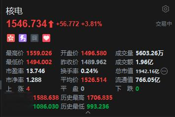港股核电股集体走强,其中,中核国际涨超18%,中广核矿业、中广核新能源涨5超%,中广核电力涨超3%。