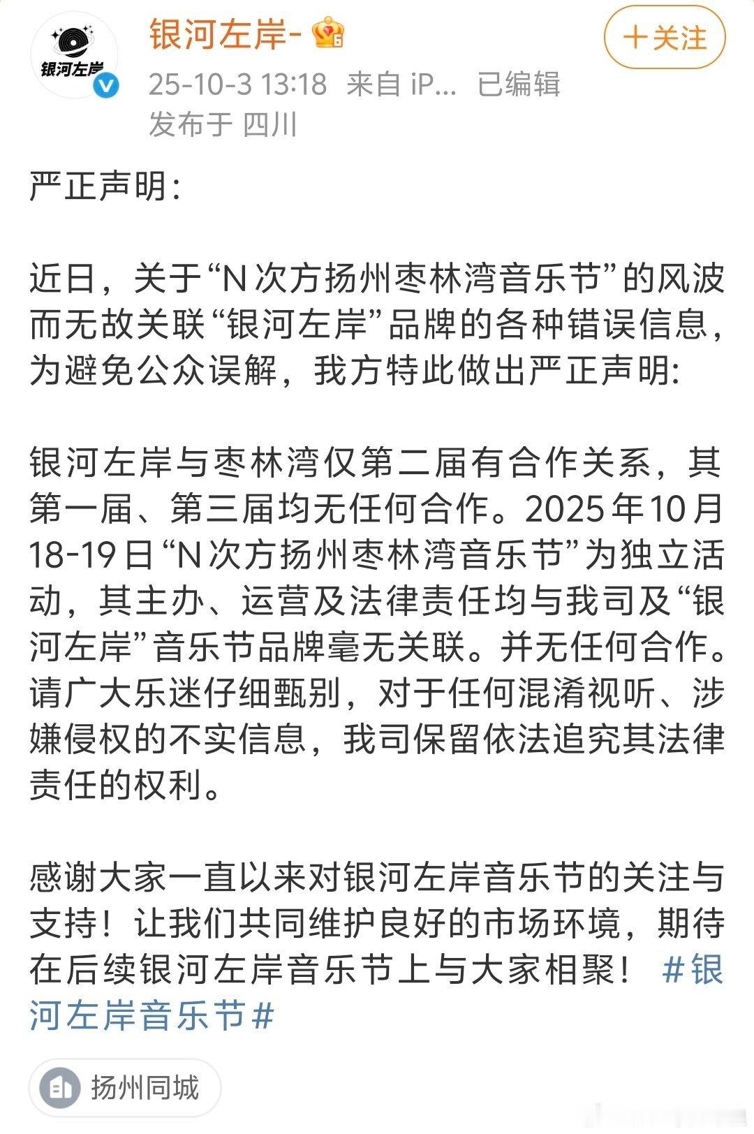 银河左岸发声明:枣林湾音乐节为独立活动,现在与“银河左岸”音乐节品牌毫无关联,并