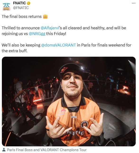 Fnatic官方宣布Alfajer将回归队伍出战对阵NRG的胜者组决赛!并表示称Alfajer已经完全康复可,同时替补Doma也将留在巴黎备战决赛周的比赛!
