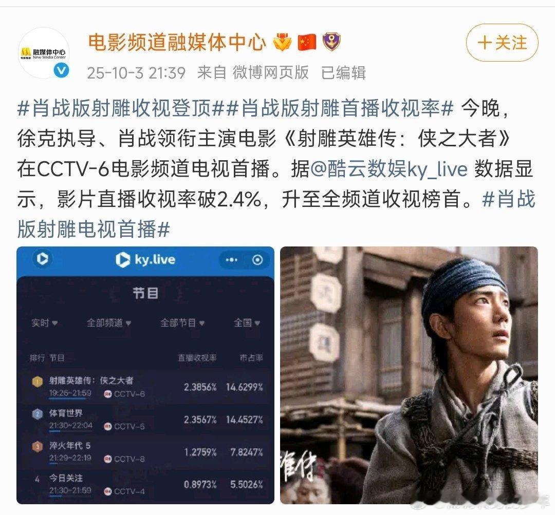 肖战版射雕首播收视率射雕英雄传侠之大者首播收视率2.41%,全频道收视第一🔥🔥肖战这强大的路人盘 ​​​