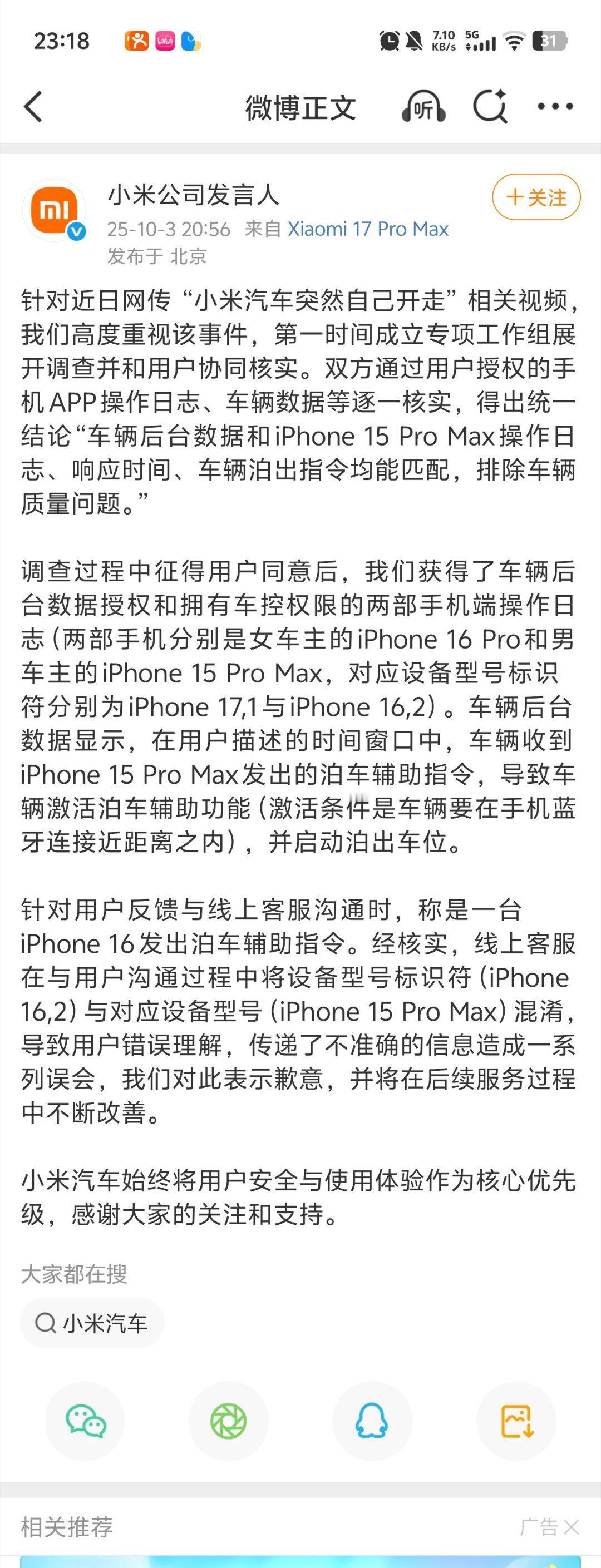 小米公司发言人的回答:车辆后台数据显示,在用户描述的时间窗口中,车辆收到iPhone 15 Pro Max发出的泊车辅助指令,导致车辆激活泊车辅助功能(激活条件是车辆要在手机蓝牙连接近距离之内),并启动泊出车位。