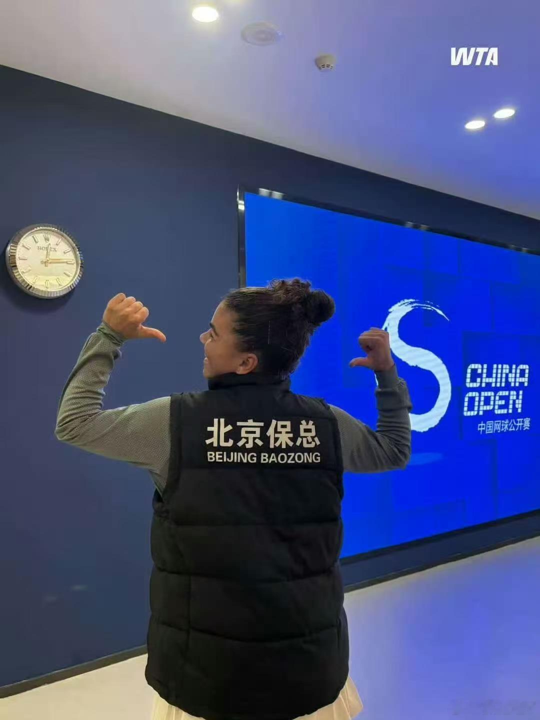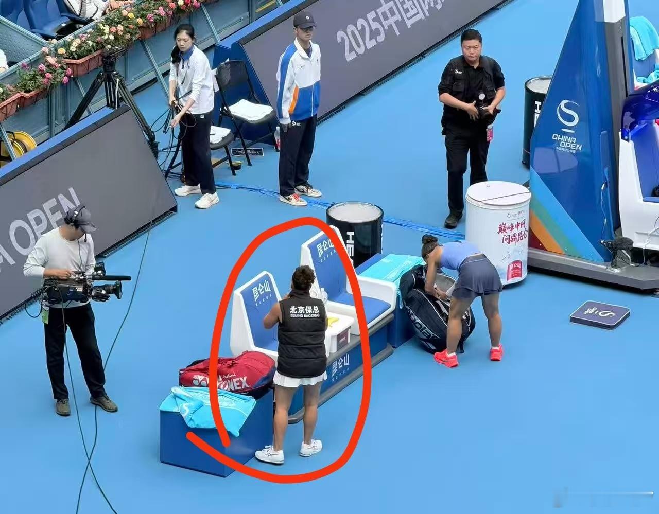 保总今天是穿着工服进场的。2025中网保利尼穿保总马甲登场