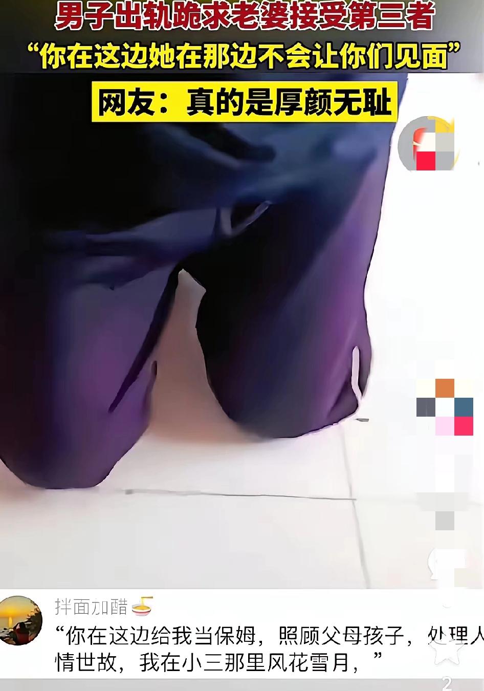 厚颜无耻的男人! 见过离谱的,没见过这么刷新三观的!这男的出轨就算了,居然跪地上求老婆接受第三者,还说“你在这边,她在那边,保证不见面”,这脑回路简直比九曲十八弯还离谱。 他在家当甩手掌柜,把老婆当免费保姆,让人家照顾老人孩子、操持家务,自己倒好,在外边和小三风花雪月。转头还好意思提这种荒唐要求,真当婚姻是他开的“后宫”,老婆是召之即来挥之即去的附属品? “男儿膝下有黄金”在他这根本不管用,为了一己私欲,连尊严都能丢。婚姻里最基本的忠诚和坦诚,他是一点儿没占。要是真没感情了,大大方方提离婚,别既想占着老婆的好,又放不下外面的新鲜感,把妻子的付出当理所当然。 我倒觉得,妻子要是硬气点,直接让他二选一,别给他这种得寸进尺的机会 。你们说,遇到这种男人,是该果断离婚,还是再给他一次机会?