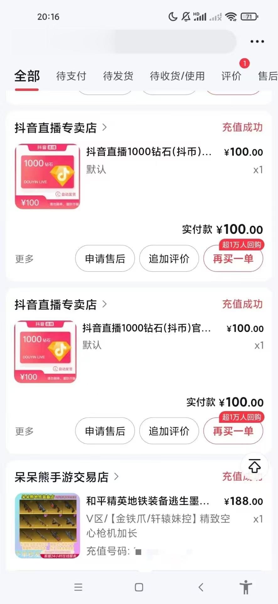曹先生儿子在抖音打赏直播与购买游戏装备的部分订单。受访者供图