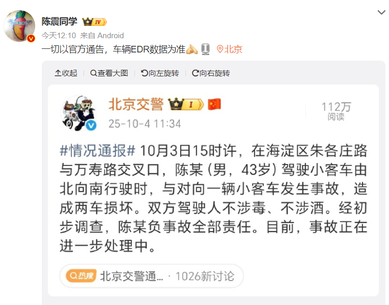 北京交警通报陈震发生车祸北京交警的公告:双方驾驶人不涉毒、不涉酒。经初步调查,陈某负事故全部责任。