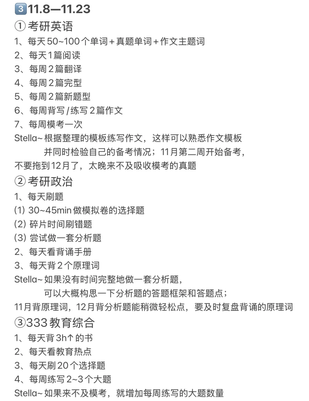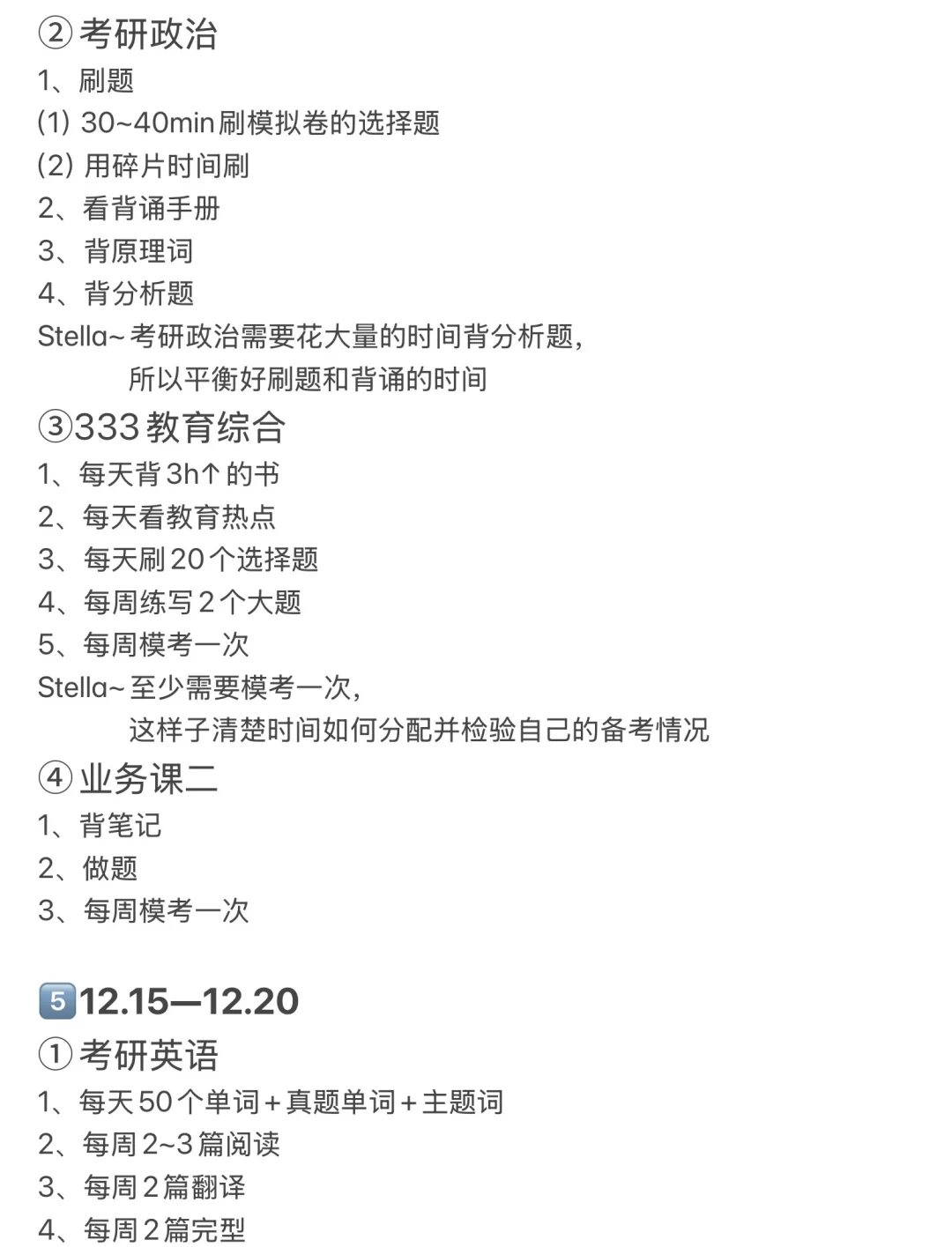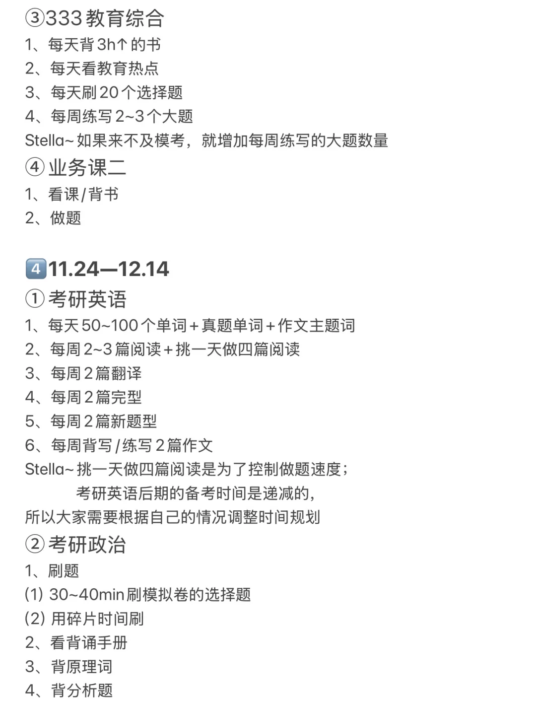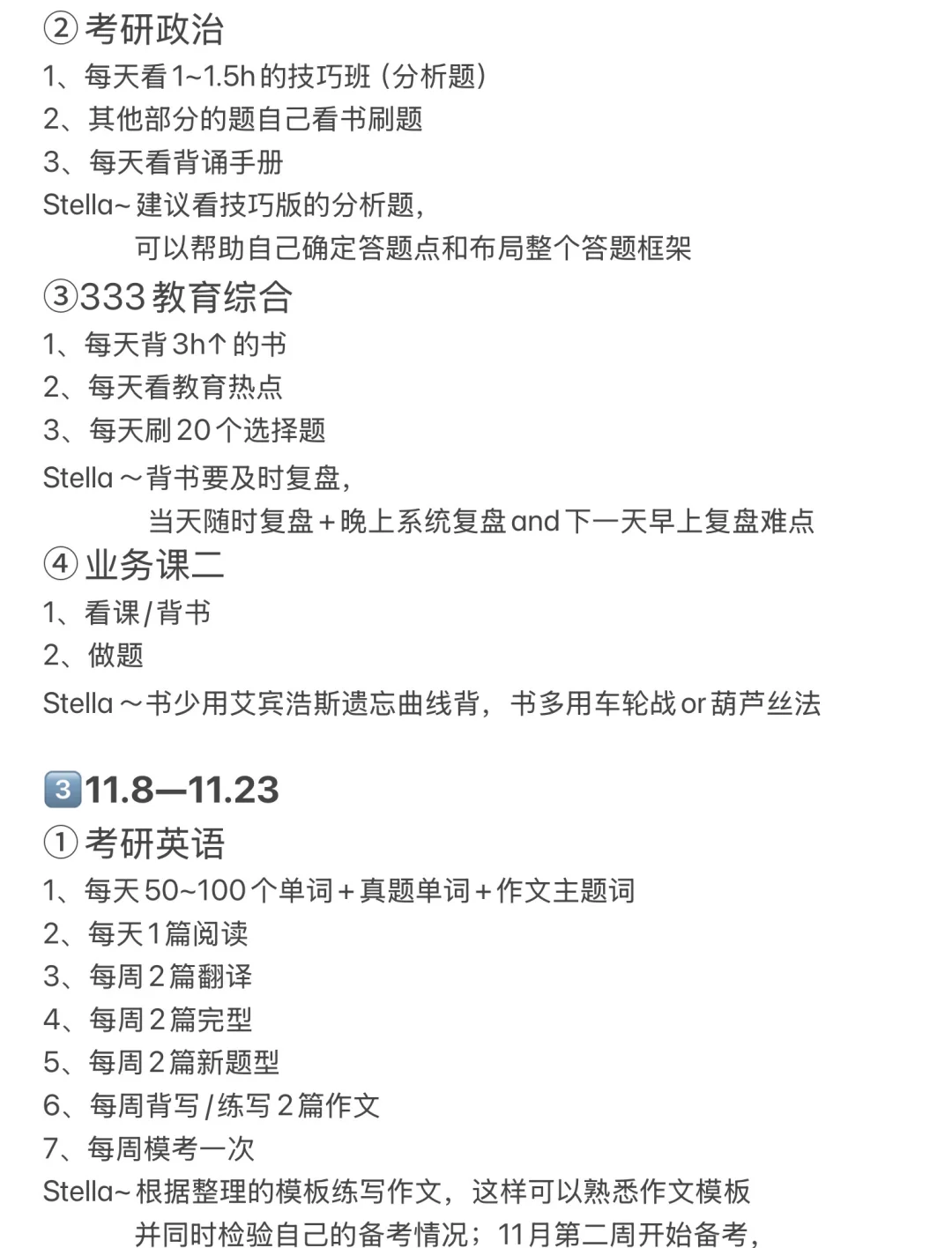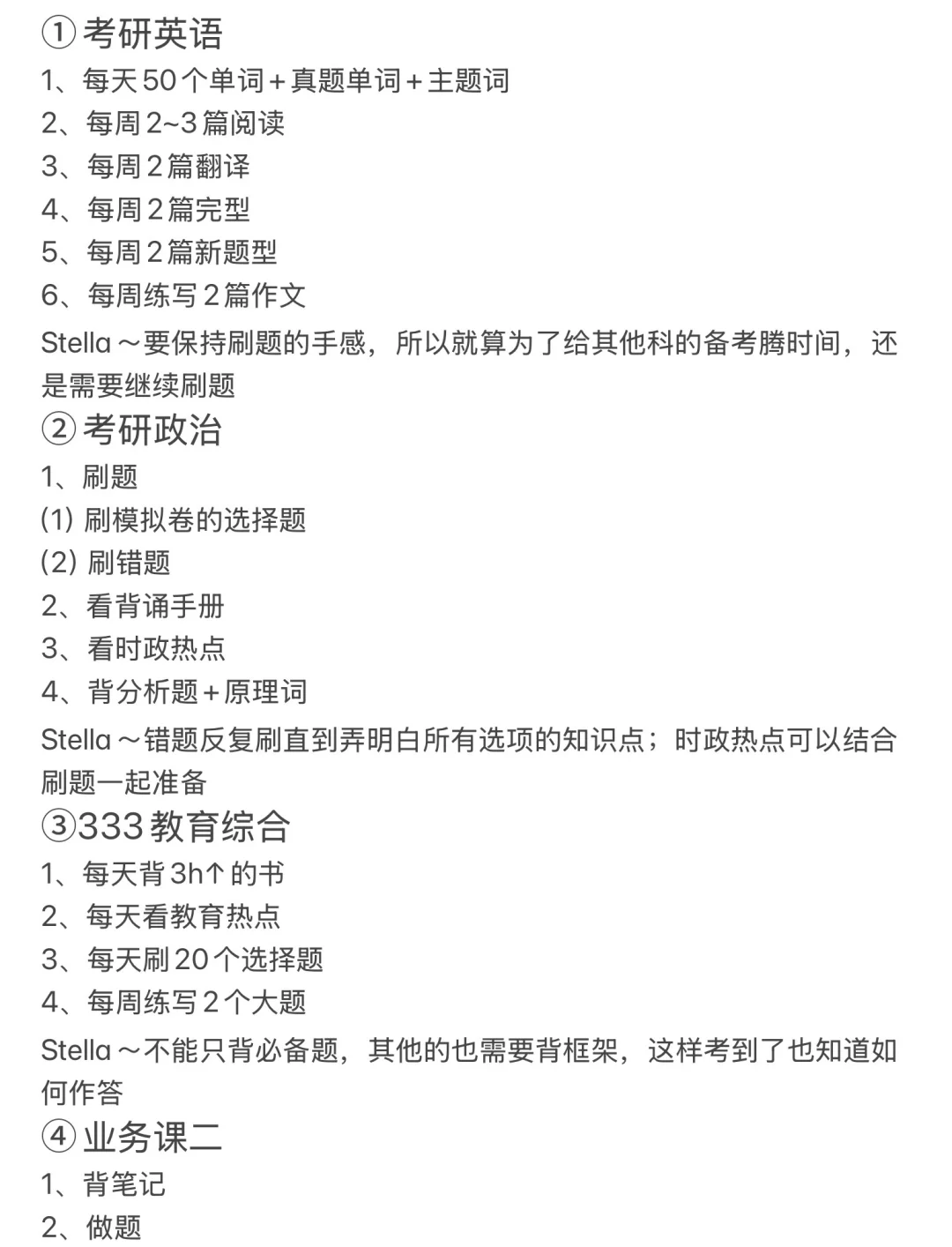 Stella~作文不用看课,直接用七步背写法背写作文,根据这一步“思考每句话如何用来写其他话题”帮助整理模板;阅读、翻译、完型和新题型不用看课,直接对照方法论刷题or自己通过理解刷题;因为刚开始备考,所以单词量不够,那么在做阅读题之前,可以先看一遍该篇阅读的重点词汇