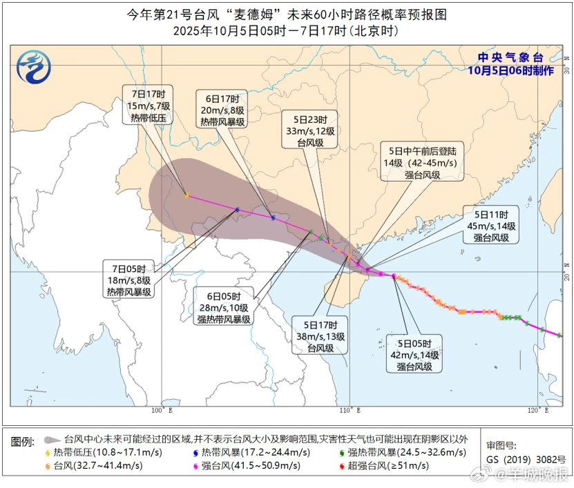 中央气象台预计,10月5日8时至6日8时,南海西北部和中西部海域、东沙群岛、西沙群岛、北部湾、琼州海峡、广西南部及沿海、广东南部及沿海、海南岛及沿海将有6-8级、阵风9-10级的大风,其中南海西北部海域、琼州海峡、北部湾北部海域、广东雷州半岛及沿海、广西沿海、海南岛东部和北部沿海的风力有9-11级、阵风12-13级,部分海域或地区风力可达12-14级,阵风15-16级。