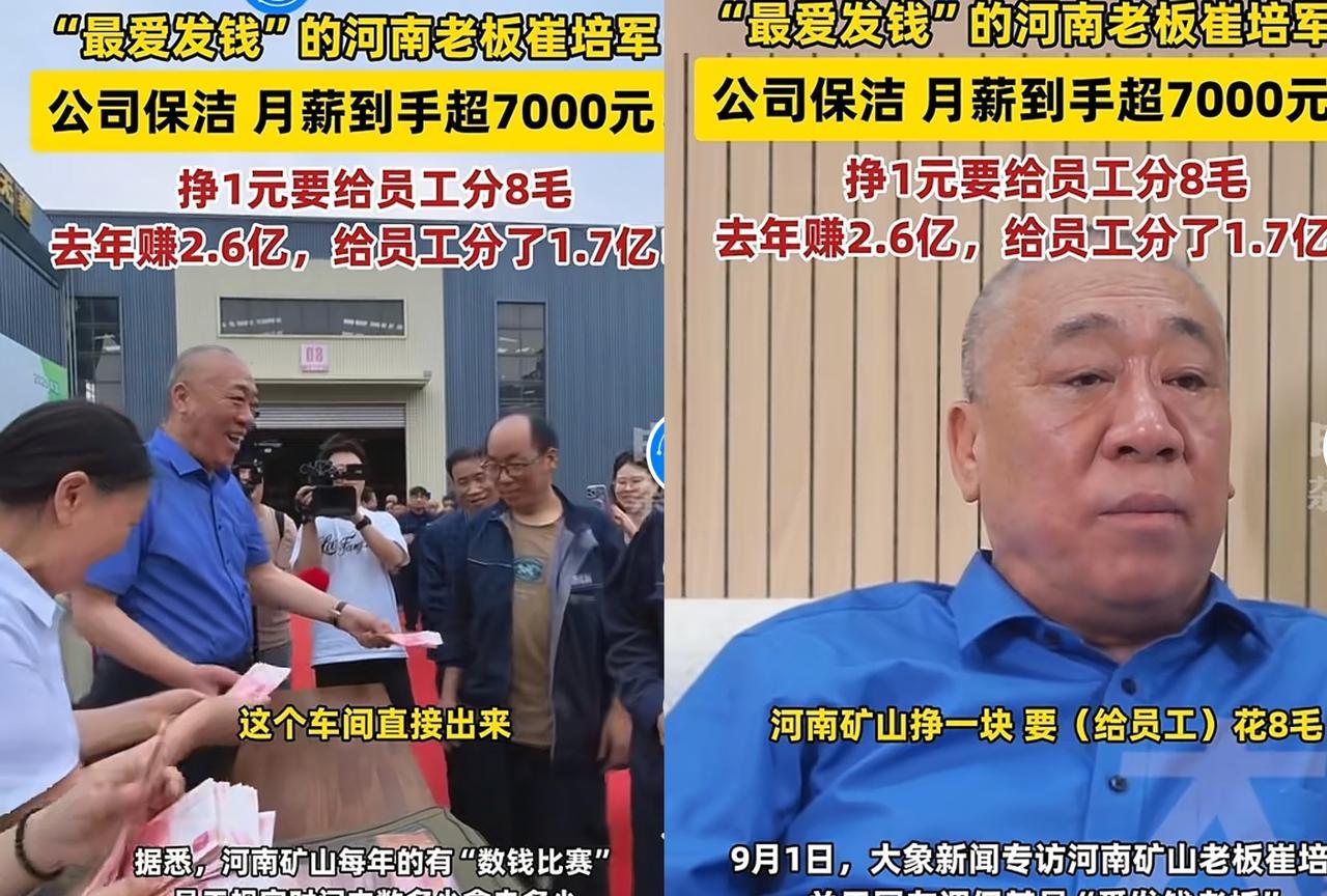 一言不和就发钱的崔培军崔总,双节来临之时又任性了,10月4月和5日连续两天举办中秋孝文化节,摆桌超过千桌,二十多个菜,且都是绝对折硬菜,这也是崔培军公司举办的第12届孝文化节了。 当然,崔培军的孝文化节,吃只是一个环节而已,真正让员工们激动的,是崔总又发钱了,这次崔总除了给每位员工父母送上600元的节日礼金之外,还在现场发放了1000万元的现金,公司1万多人见者有份。 实际上,孝文化只是崔培军众多捐资活动中的其中之一,几十年来,崔培军除了在公司大力提倡孝文化之外,他还通过各种方式发钱。 崔培军成立的助学基金会已经有20多年的历史了,每年捐献的资金从最初的数万元到现在的上百万,受到他资助的学生在6000人左右。崔培军在助学时,这些年一直保持一个习惯,那就是坚持把现金交到每一个学生手中。另外,如果有学生确实有困难,找到崔培军的话,他也会慷慨相助。 除了孝文化节,还有妇女节,甚至连麦收时都还有收麦补贴。 每年公司的年终大会,才是崔培军发钱的高潮时刻,成捆的,堆砌如山的现金,在崔培军手中就像砖头一样普通。当然,崔培军最喜欢的还是突发性发钱,有时没有任何理由的,就会随手发钱。 崔培军的任性发钱,也引来很多质疑,很多人认为他是在作秀,是在通过发钱这种夸张的方式吸引注意,提高公司的知名度。 我想,每一位企业员工,都愿意自己的老总像崔培军一样喜欢随时作秀。这样的秀,越多越好,就怕有些老板秀都不愿意秀。 #头号创作者激励计划#