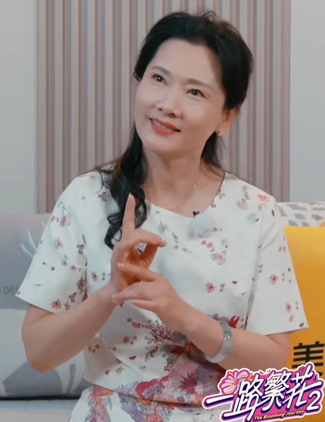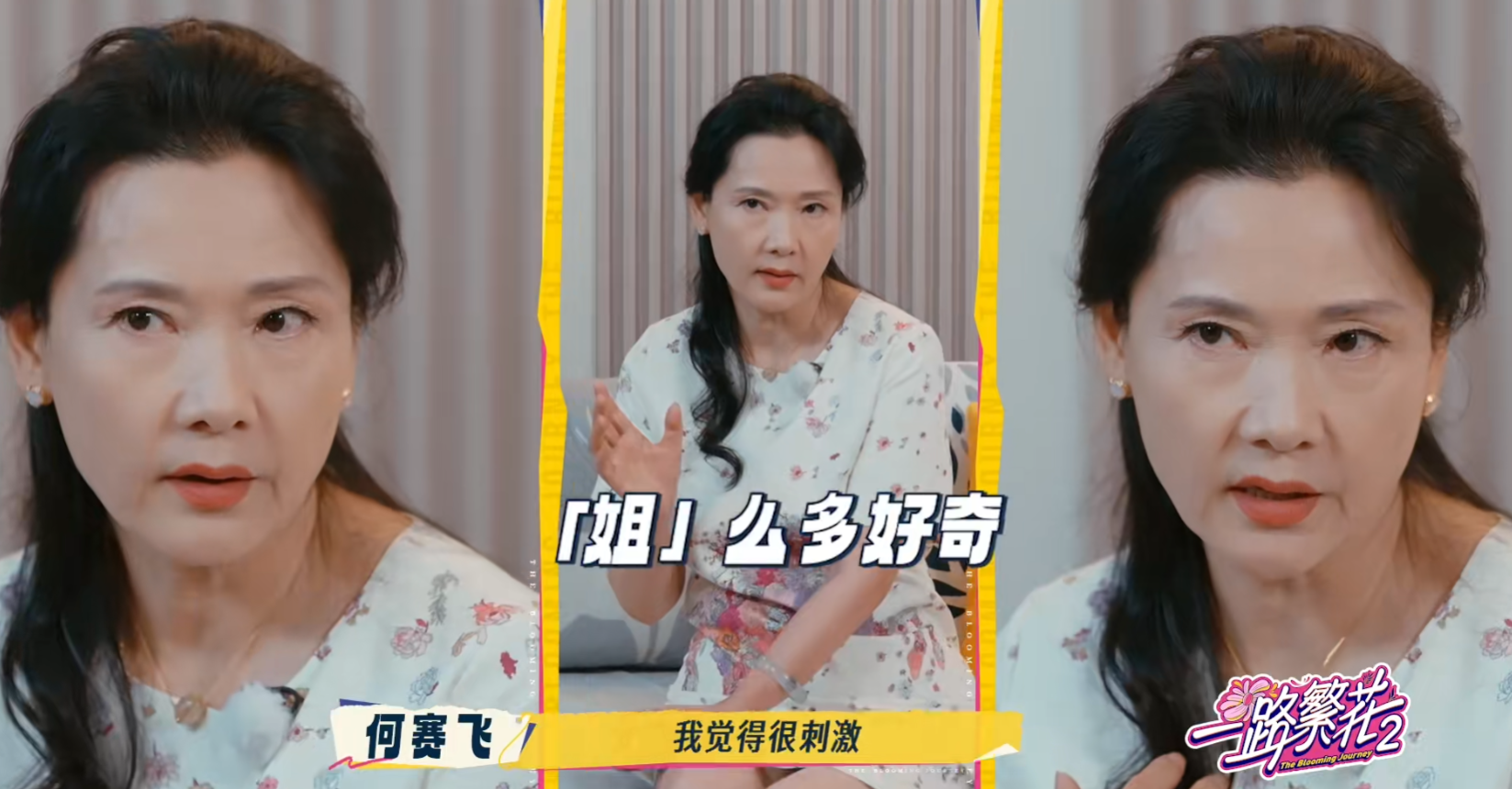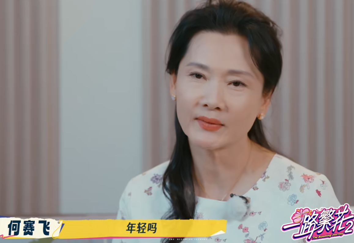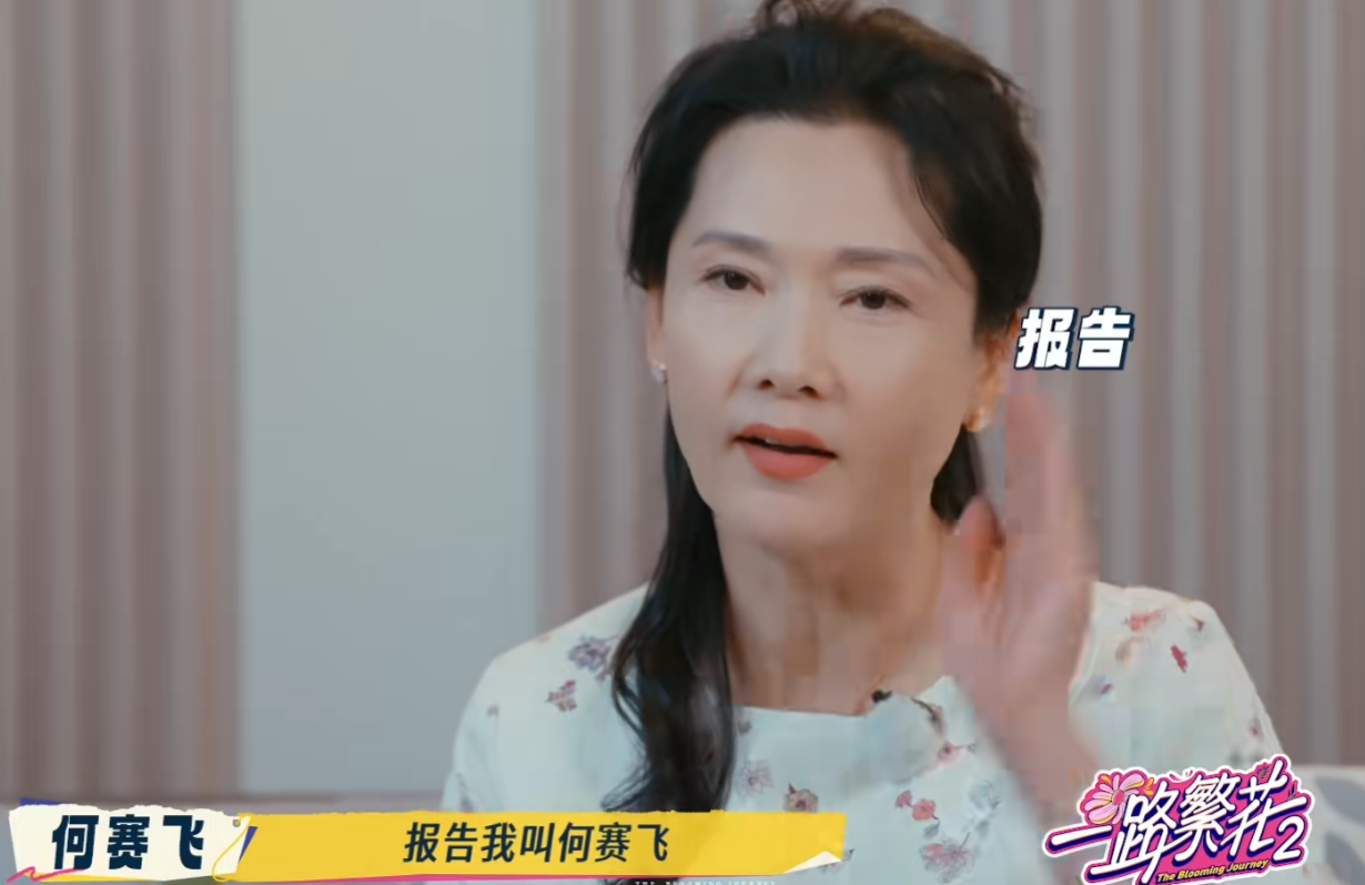 何赛飞在《一路繁花2》做自我介绍,她顽皮地举起手说:“报告!我叫何赛飞,1963年4月11号出生,怎么着?年轻吗?”