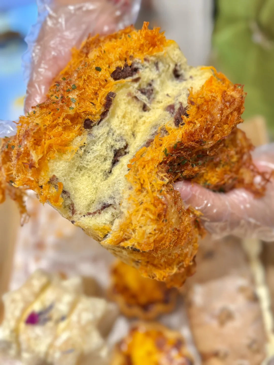 🫘红豆松松吐司:拿在手里沉甸甸的全是料!咸香肉松给得超足,搭配沙沙的红豆沙,咸甜交织越吃越上头🤩!
