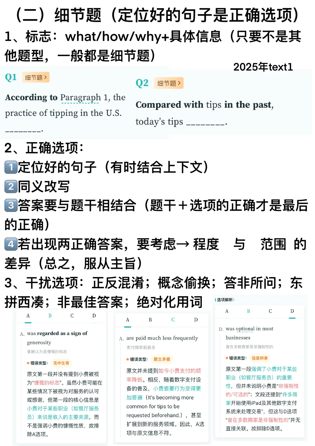 注:细节题是高频考点(需要我们仔细对比原文和答案,不要自己构想)