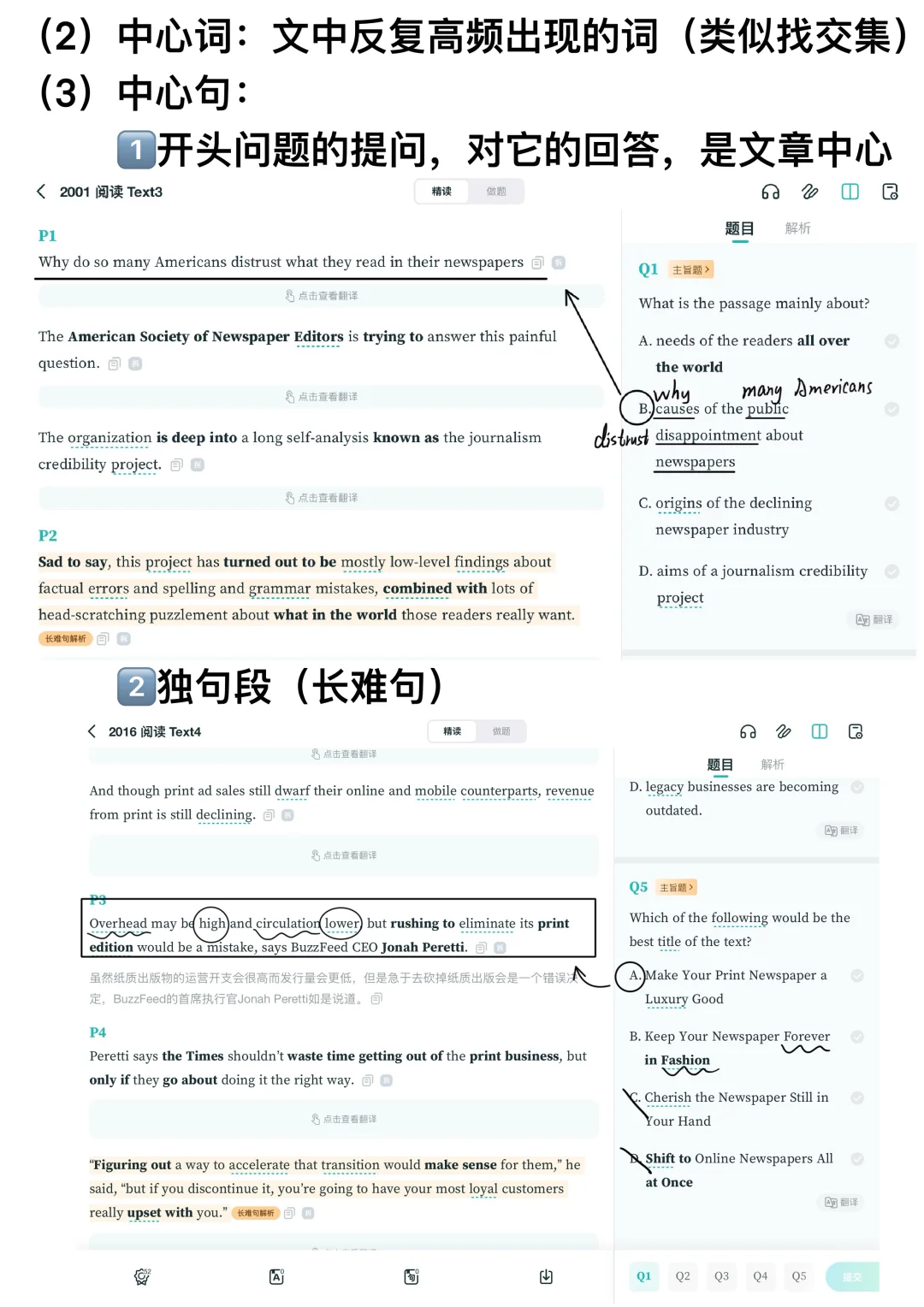 1️⃣文章框架→各段主题句串一起,找文章主旨