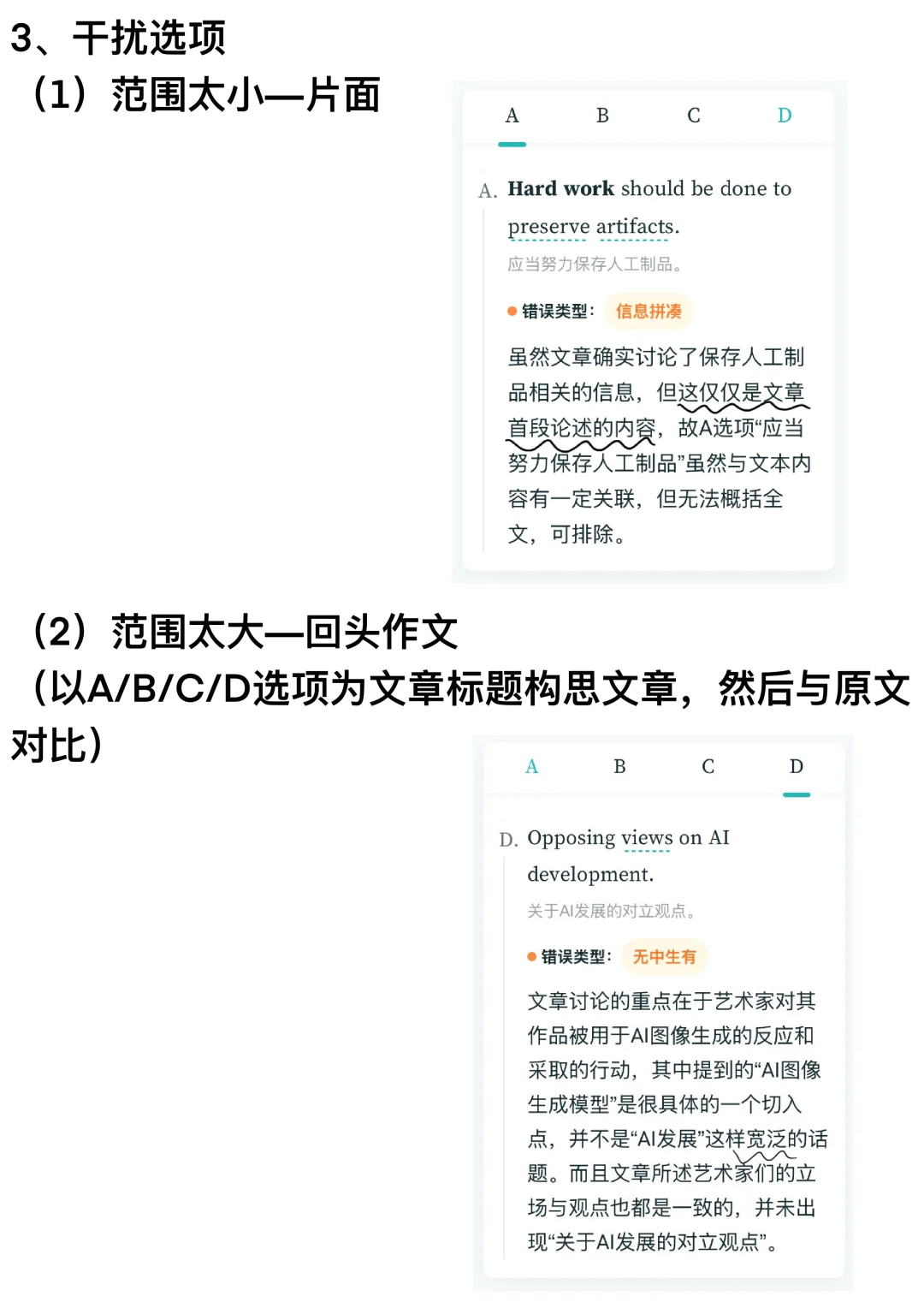 2、干扰选项:正反混淆;概念偷换;答非所问;东拼西凑等