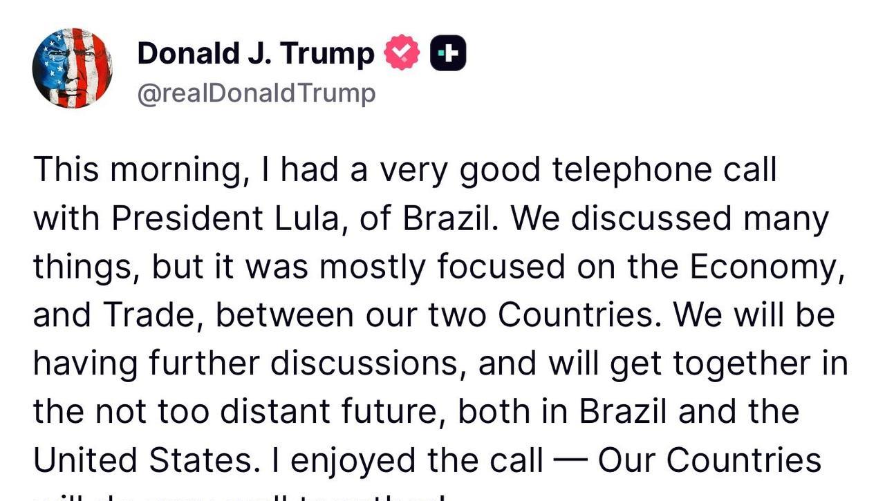 快讯:美国总统特朗普发帖称与巴西总统卢拉刚刚通电话——今天早上,我和巴西总统卢拉