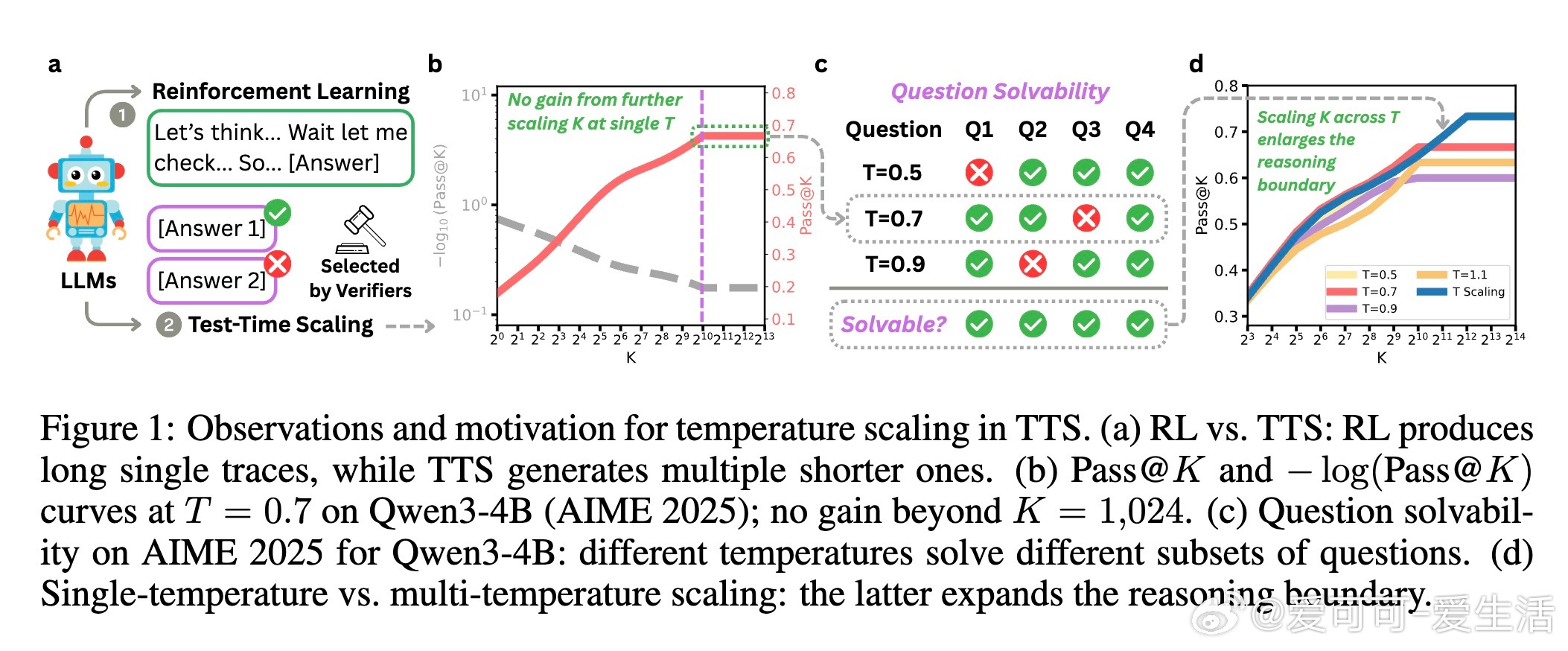 大语言模型(LLMs)推理能力提升,传统的测试时扩展(TTS)通过增加采样数量K来生成多条推理轨迹再择优,但当K极大时,性能饱和且仍有难题无法解决。本文发现:不同采样温度T能解答不同难题,单一温度限制了模型潜力。