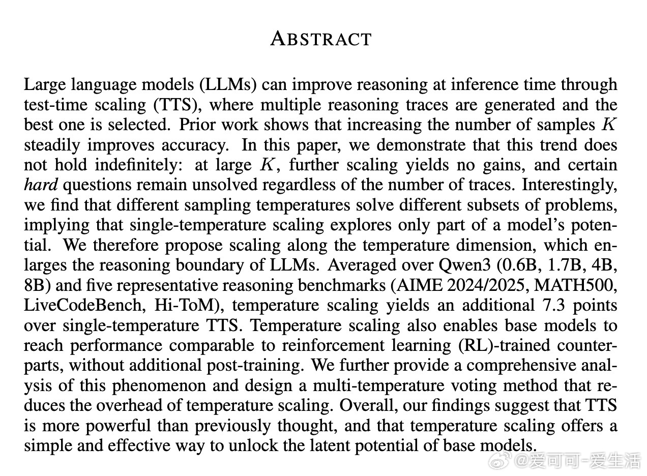 - 温度采样为测试时推理性能扩展提供简单有效的新工具,无需额外训练成本。