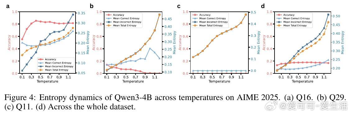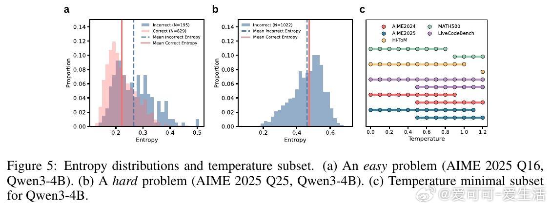 - 通过熵分析揭示,正确答案轨迹在不同温度下表现出不同的不确定度,难题往往只能在特定温度下被成功解决。