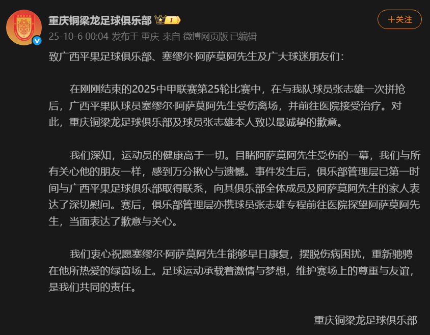 在刚刚结束的2025中甲联赛第25轮比赛中,在与我队球员张志雄一次拼抢后,广西平果队球员塞缪尔·阿萨莫阿先生受伤离场,并前往医院接受治疗。对此,重庆铜梁龙足球俱乐部及球员张志雄本人致以最诚挚的歉意。