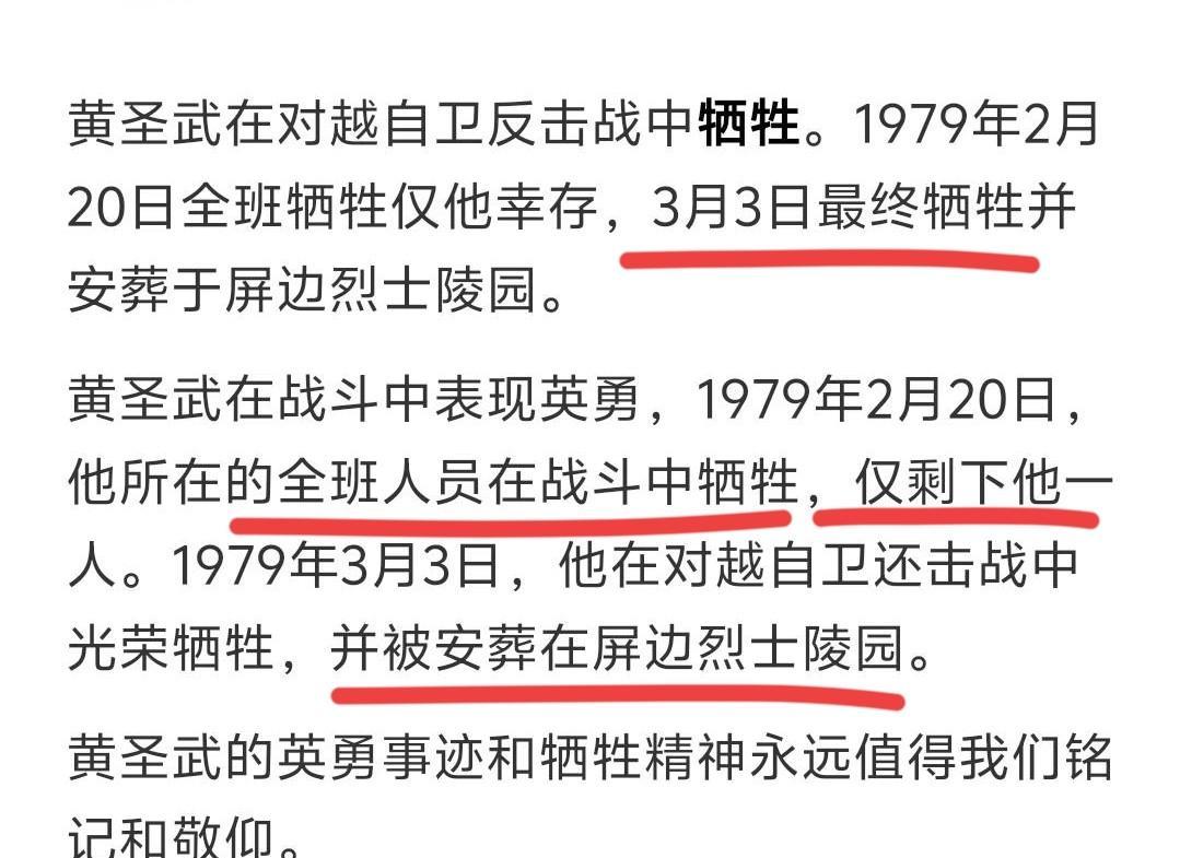 【情景复现】战地记者问广西狼兵黄圣武,叫你怎么不应,你有心事?黄胜武说,班长和同志们都牺牲了,只剩下我了。 黄圣武给弹夹里压着子弹,又说,我要抄家伙去干他们,我马上就要上去了,不打算回来了。 最后黄圣武对战地记者说,算了,给你说你也不会明白。 说罢,他起身走向战场。 【中越自卫反击战时真实的黄圣武,1979年3月3日牺牲在战场上】