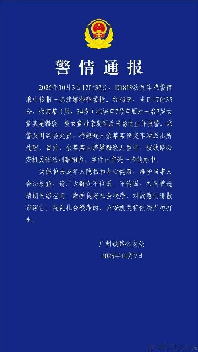 2025年10月3日,D1819次列车7号车厢发生一起猥亵案,34岁男子余某某对