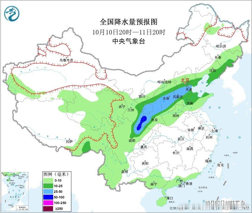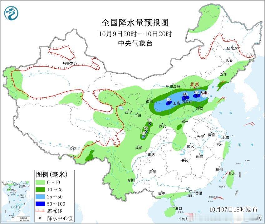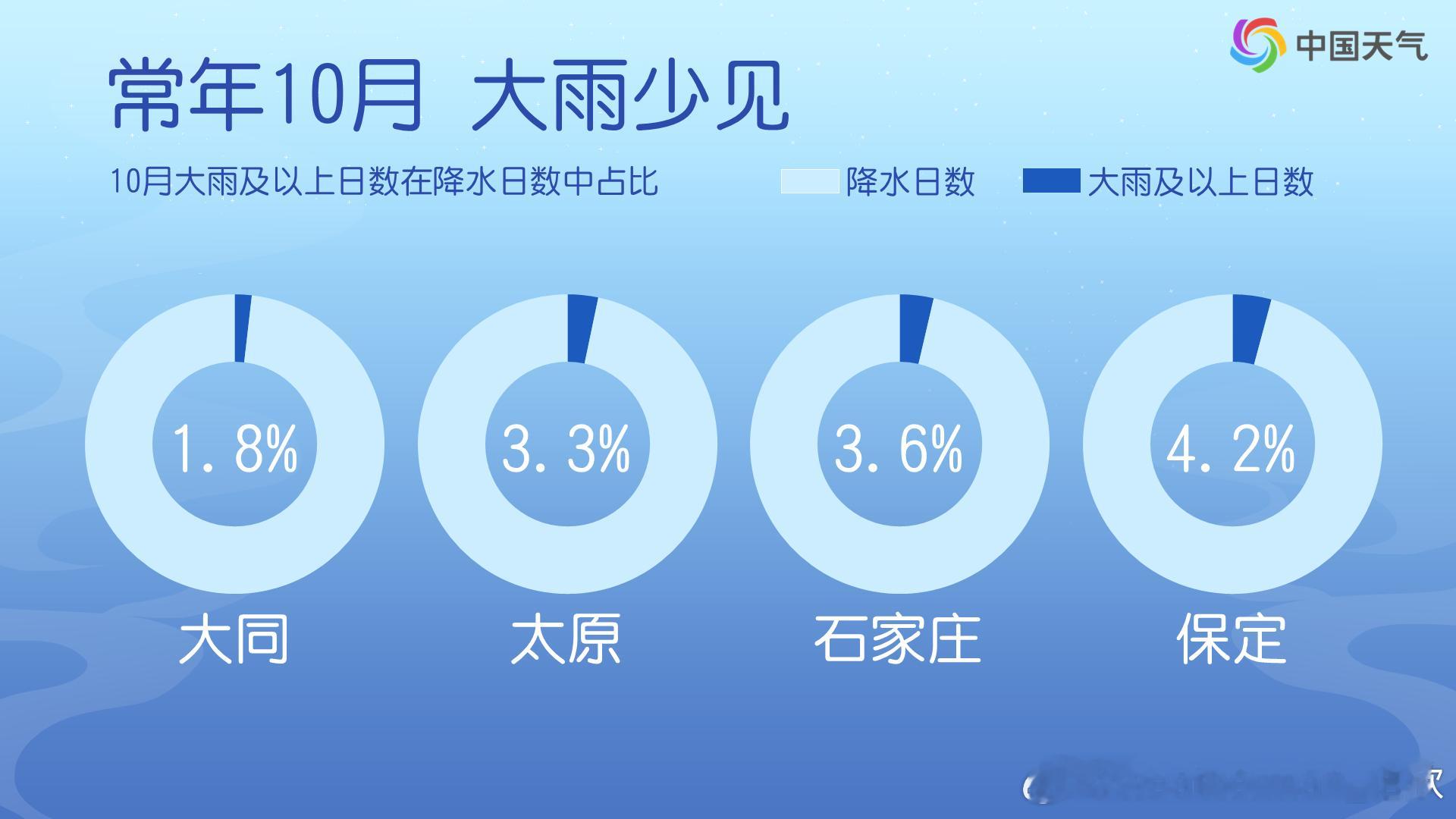 8-10日降水核心在华北一带。11-13日雨带开始南落,陕西四川等地降雨又会增强。常年10月,华北经常是秋高气爽,此时连续阴雨和大雨都少见。从过往统计看,大同、太原、石家庄、保定,10月出现25毫米以上大雨的概率,不到5%。太原和石家庄未来5天都划入25毫米以上的降雨区,非常罕见!