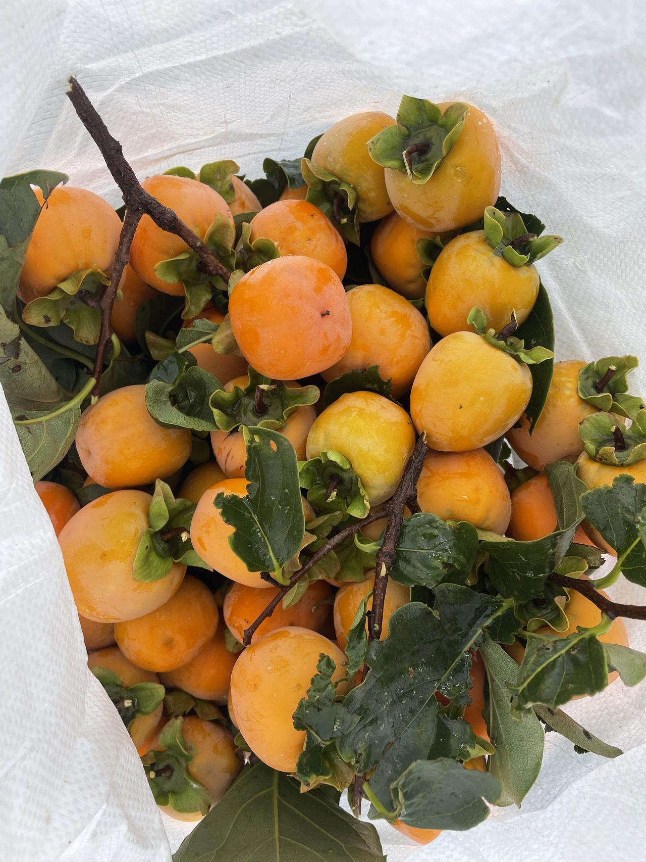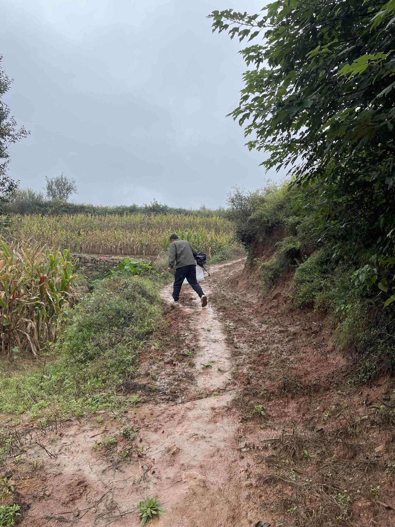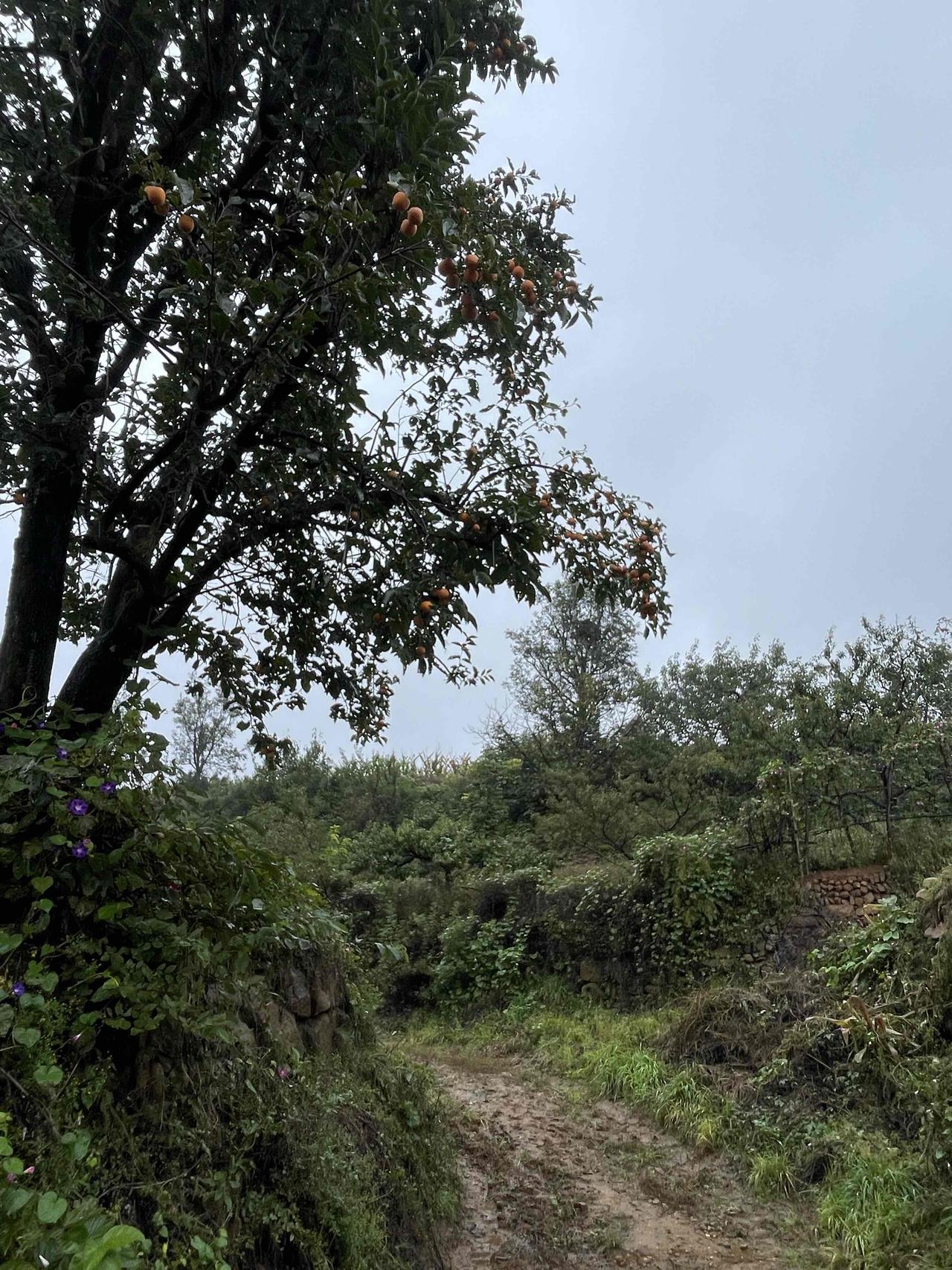 柿子树在半山上,开车到山前,走路上坡。一个礼拜的连阴雨,让这土路软糯得毫无反抗力