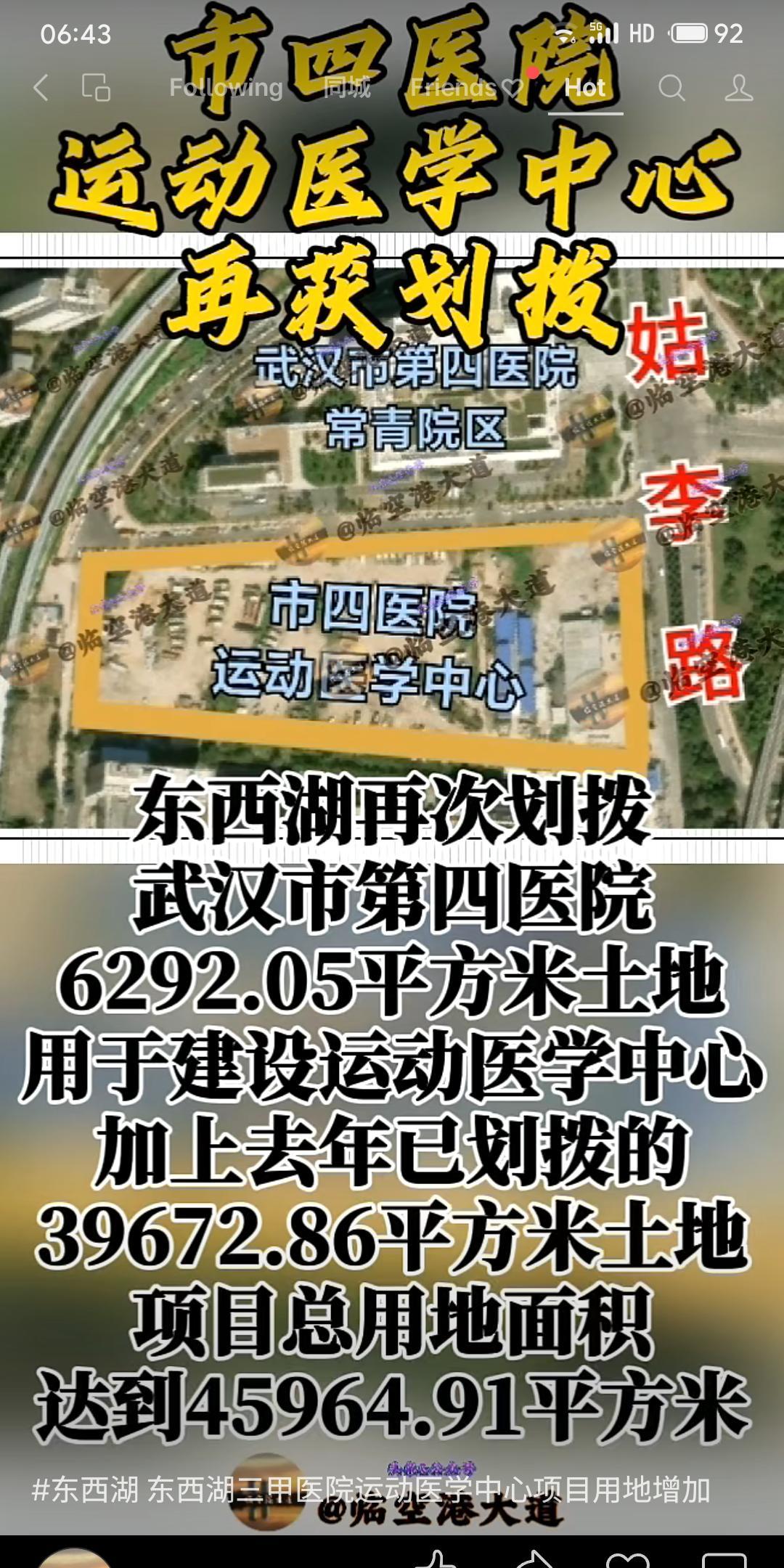 #带定位聊本地新鲜事# 武汉东西湖区再次划拨6292.05平方米土地助力武汉市四医院运动医学中心建设,叠加去年已划拨面积,项目总用地超4.5万平方米。此举强化运动医学未来广泛需求趋势之下的基建预备,扩容区域优质医疗资源,彰显对医疗资源布局与民生健康的重视。