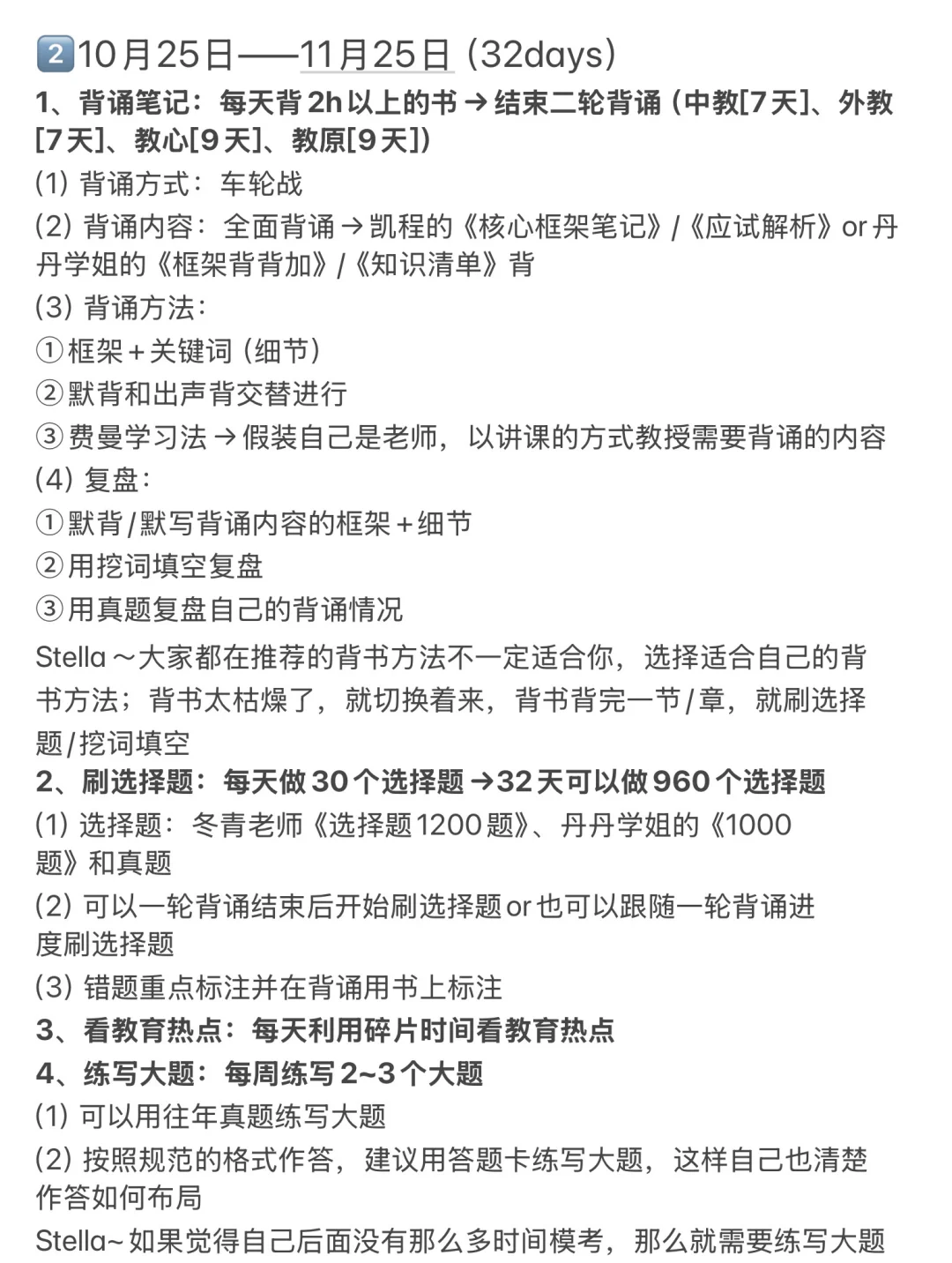 1、背诵笔记:每天背2h以上的书→结束二轮背诵(中教[7天]、外教[7天]、教心[9天]、教原[9天])
