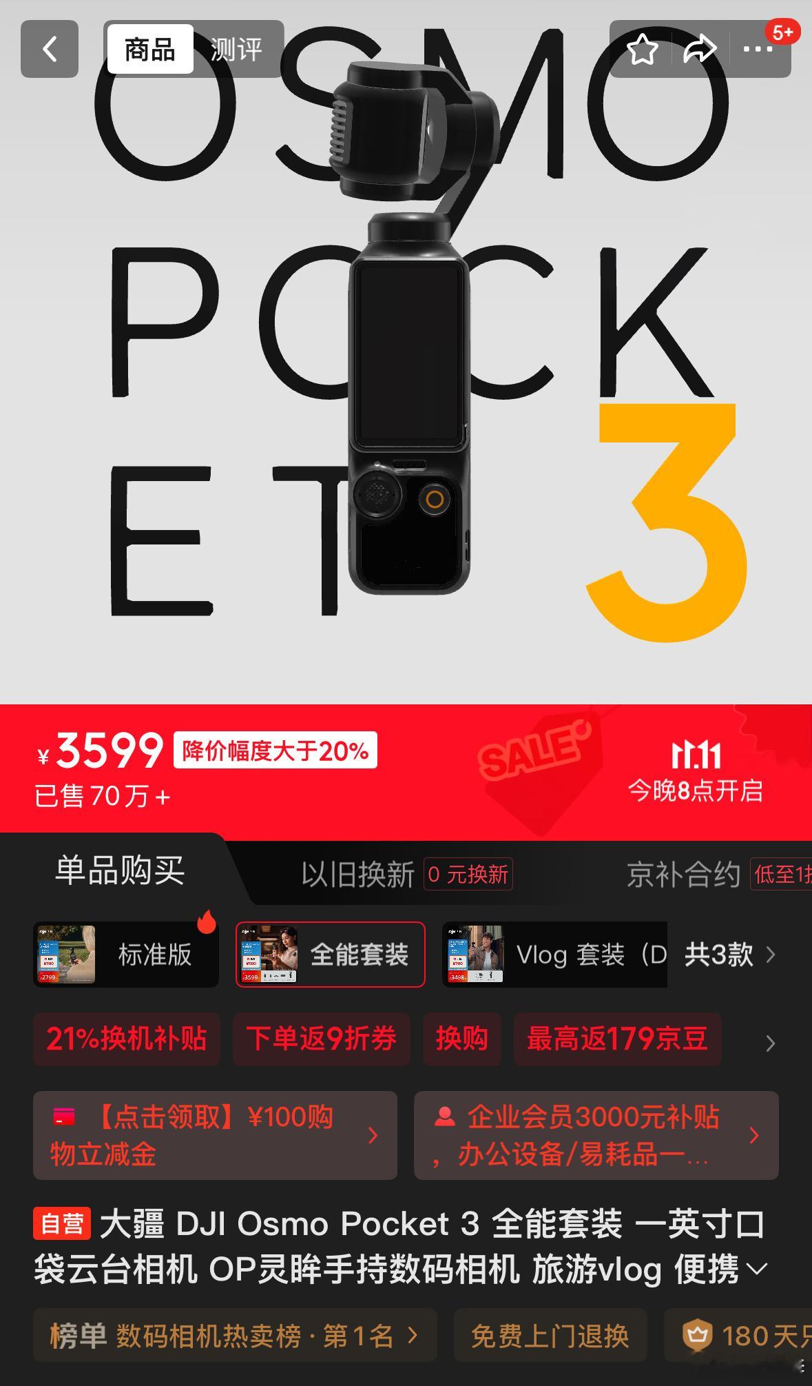Pocket 3裸机2700,全能套3500,也比之前便宜了1000,据说是因为Pocket 4快出了。不过这代3肯定也是够用的,推荐全能套。