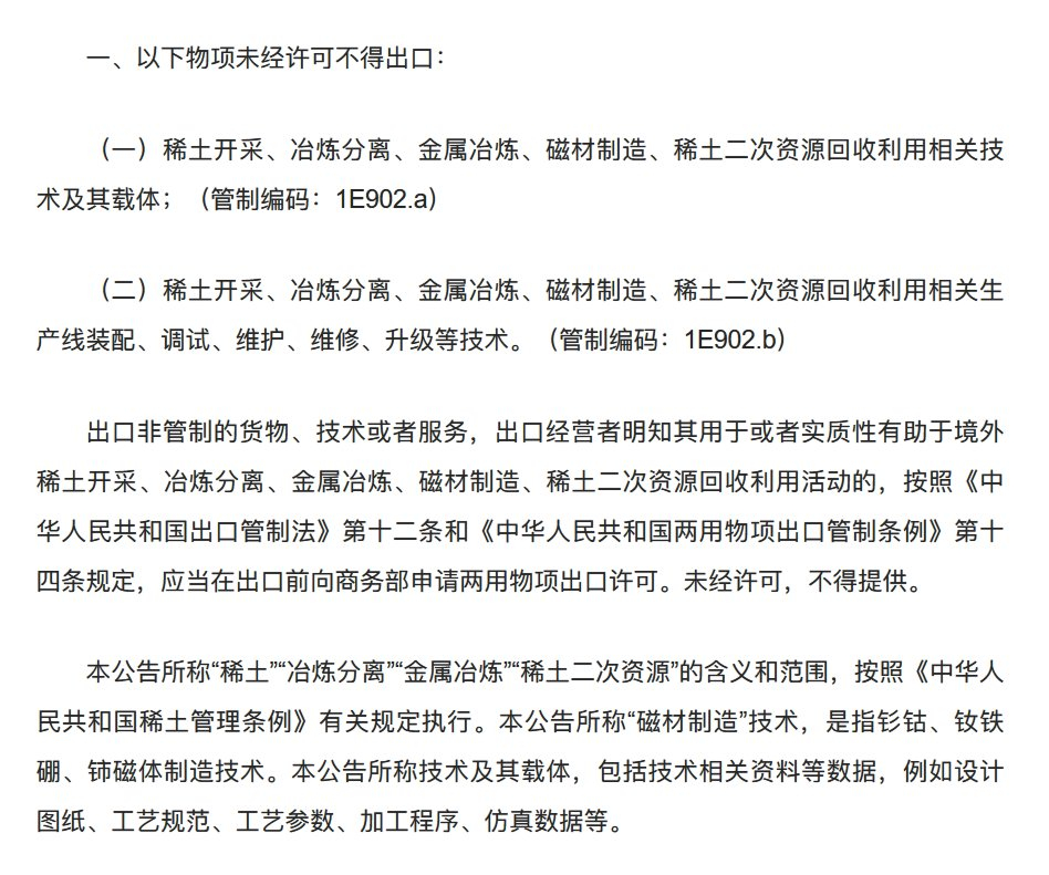 (一)稀土开采、冶炼分离、金属冶炼、磁材制造、稀土二次资源回收利用相关技术及其载体;