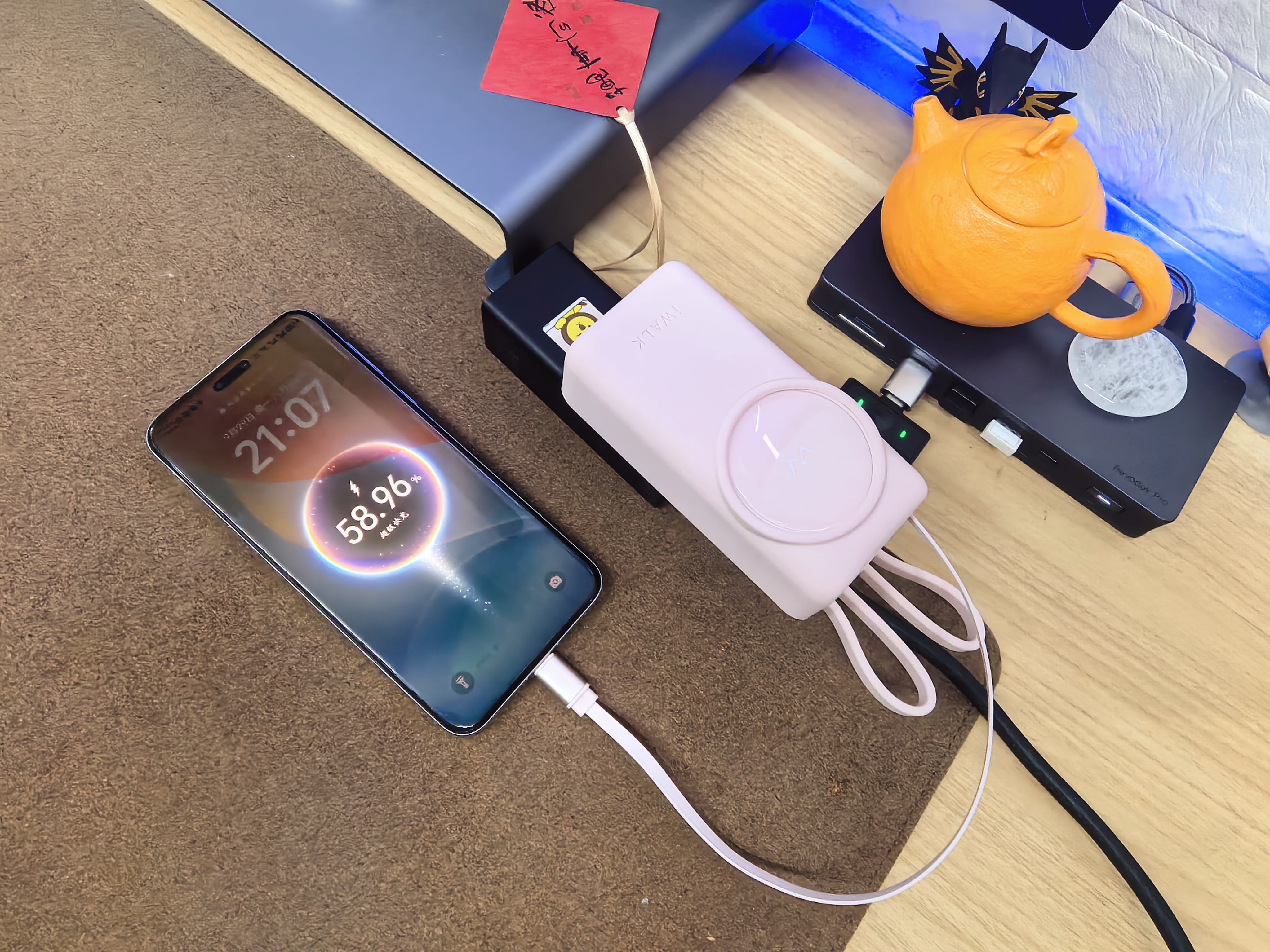 真的,我之前吃够了忘带充电线的苦!明明包里揣着充电宝,结果线落家里了,简直要命。记得有回在地铁站,手机就剩1%,跑遍站台找共享充电宝,急得我原地打转……所以当我发现iWALK这个三合一能量兔居然自带一根60厘米伸缩线的时候,果断入手! 这设计太懂懒人了!线就藏在机身里,轻轻一拉就出来,插上手机就能充。用完一推,“嗖”一下就收回去,再也不怕线在包里缠成一团。出门少带一根线,整个人都轻松了。 更绝的是,居然还自带折叠插头!对我这种常年加班的人来说简直是救命设计。以前在办公室充电,桌上堆着充电头、充电宝、线,乱得像盘丝洞。现在直接把能量兔底部插头掰开,往墙插一怼,就能给充电宝回血。桌面立马清爽,加班都变得没那么烦躁了。 充电速度也很顶,30W快充,我手机早上出门前低电量,插上十几分钟就回血大半。而且它自己补电也快,10000毫安容量,一小时左右就能充满。 数显屏我也超爱,剩余电量百分比一目了然,再也不靠猜。还有3C认证+车规级电芯,充电不烫手,能带上飞机,安全感满满。 现在它简直成了我出门的“电力担当”,通勤、加班、逛街、旅游……走哪带哪。再也不用到处找共享充电宝,也不用带一堆杂乱的线。说真的,有个靠谱的充电宝在身边,手机电量自由的感觉,太踏实了!
