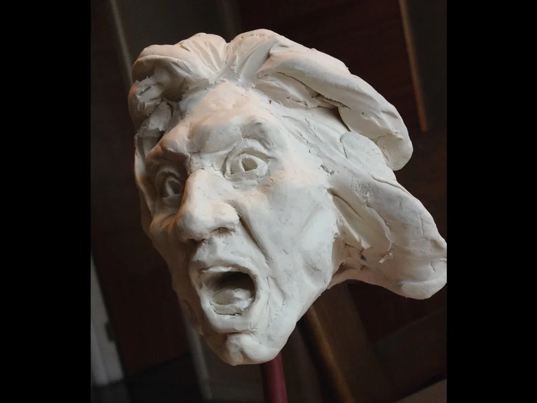 我特意把自己做的一件小雕塑放大,摆在他身后的雕塑台上,