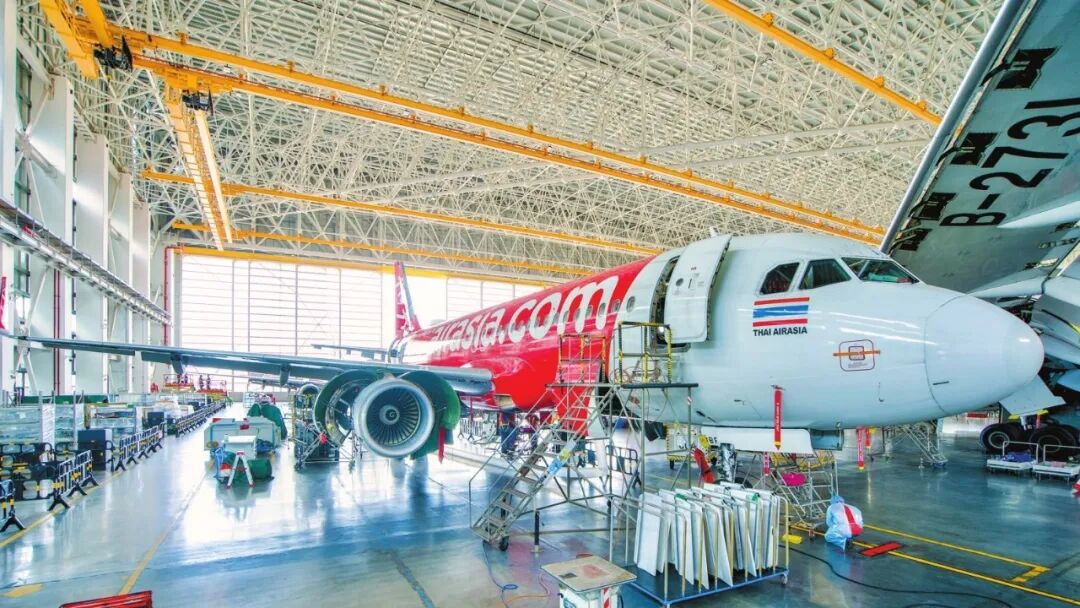 在海南自贸港一站式飞机维修产业基地定检机库,一架来自泰国的飞机正在进行零部件更换。记者苏弼坤摄