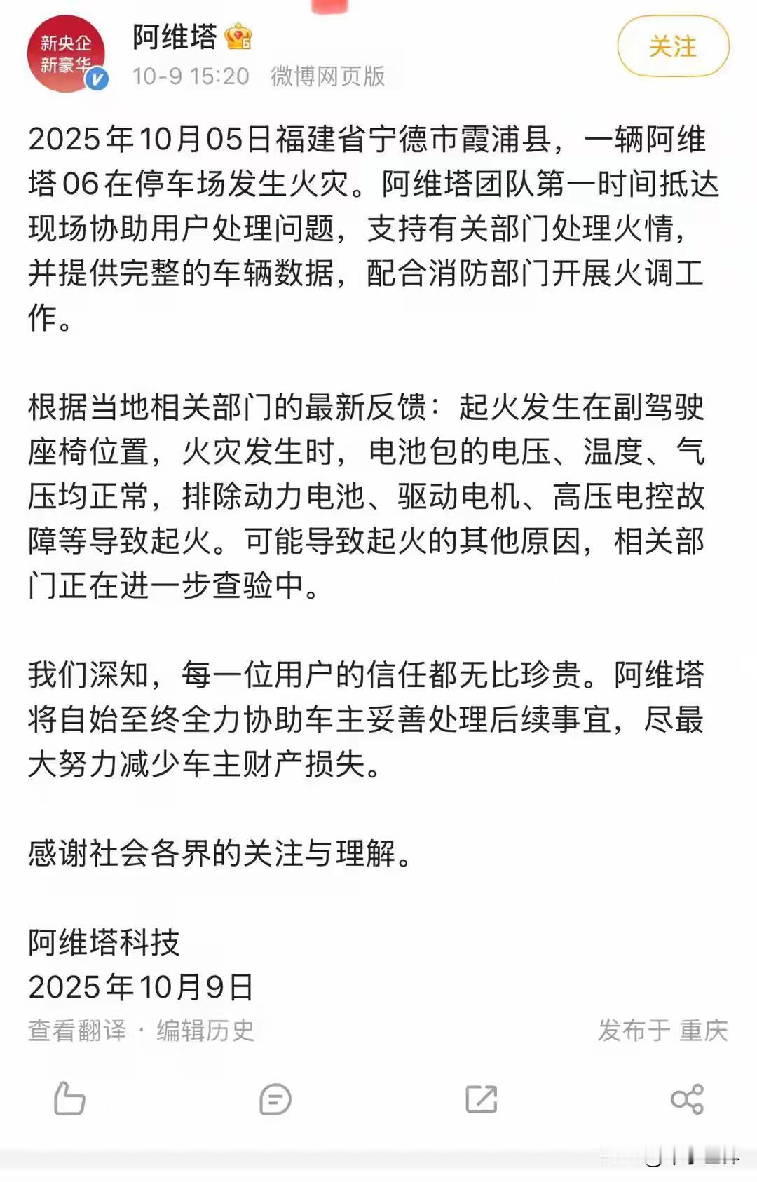 【阿维塔回应起火】10月5日,福建宁德一辆行驶仅1066公里的阿维塔06突发火灾,引燃7辆邻车,事件迅速引发热议。10月9日,阿维塔官方发布情况说明回应核心关切。 其回应包含三大关键信息:一是处置态度,称团队第一时间抵达现场,提供完整车辆数据,全力配合消防火调;二是调查进展,引用当地部门反馈明确起火点在副驾驶座椅,火灾时电池包电压、温度、气压均正常,排除动力电池、驱动电机、高压电控等三电系统故障;三是后续行动,承诺协助车主处理善后,最大程度减少财产损失。 这份回应精准回应了“电池自燃”的舆论焦点。当然,或许排除三电故障只是第一步,权威部门对起火根源的最终认定,才是重建用户信任的核心。最终起火原因,以官方调查结果为准。阿维塔 阿维塔汽车