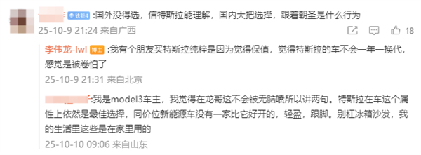 有车主坚称:“特斯拉在车这个属性上依然是最佳选择,同价位新能源车没有一家比它好开的,轻盈,跟脚。别杠冰箱沙发,我的生活里这些是在家里用的。”