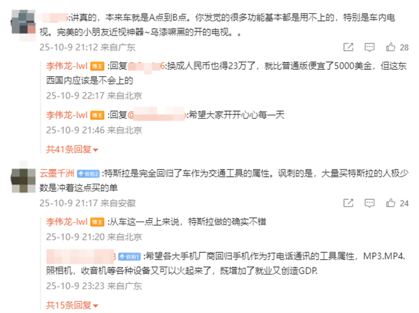 不过也有特斯拉粉丝对国内新能源不屑一顾,在博主这条微博的评论区就有人留言道:讲真的,本来车就是A点到B点,你发觉的很多功能基本都是用不上的,特别是车内电视,完美的小朋友近视神器,乌漆嘛黑的开的电视。