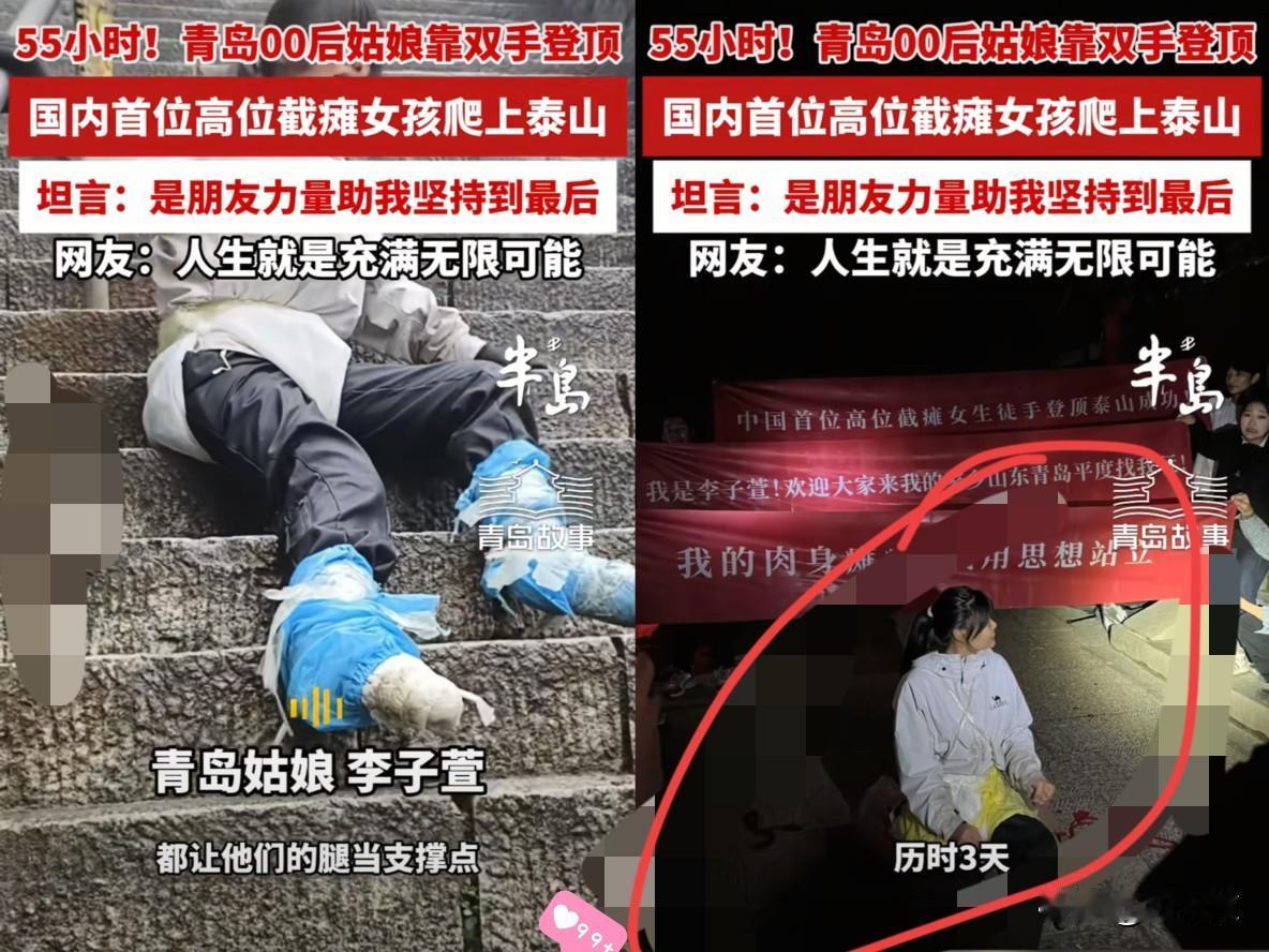 “这个女孩的毅力强得可怕!”国庆假期,青岛00后女孩李子萱用三天三夜的时间干了一件轰动全网的大事,一个日常靠轮椅行动的00后姑娘! 居然用双手撑着身体,硬生生花55个小时“挪”上了泰山顶!这哪是爬山,根本是把“不可能”踩在了脚下! 之前七月她就试过一次,双手磨得血肉模糊,裤子和手套全烂了,最后在中天门因为体力不支停下! 换作旁人早打退堂鼓了,可她偏带着三四十斤的装备再出发! 国庆登山第一天就遇上大雨,全身淋得透湿,腿磨出了血泡,身上青一块紫一块,全靠朋友想办法扶着她、帮她借力,才一级台阶一级台阶地往上挪! 有人说她“没苦硬吃”,可我觉得这才是最酷的活法!她爬的哪里只是泰山,是在跟自己的身体较劲,更是在翻越心里那座叫“怕”的山! 我们很多人明明健全,却连早起出门散步都嫌麻烦,对比她才懂:真正的勇敢从不是“轻松做到”,而是“明知难,还敢迈出第一步”! 有人直接感叹:“这简直是现实版的史铁生和余华啊!