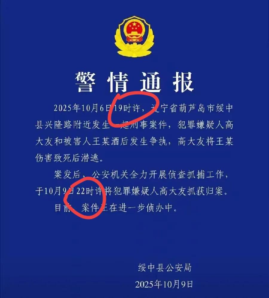 高大友被抓住了,跑了3天,晚上10点左右被抓,当地网友透露,在隔壁7、80公里的兴城市,可见没跑远,穿着短袖、拖鞋,天这么冷,荒郊野外也去不了,被抓时穿了一件,蓝色、黄色相间的运动衫外套,起码暖和点,看高大友状态,比网传照片憔悴了,显年纪大,不像44岁,像54岁,可是没有那种凶猛恶煞的劲了,像老实庄稼汉、农民工,事发晚上7点,通报证实与王某酒后争执,都是被酒害了!警示世人!