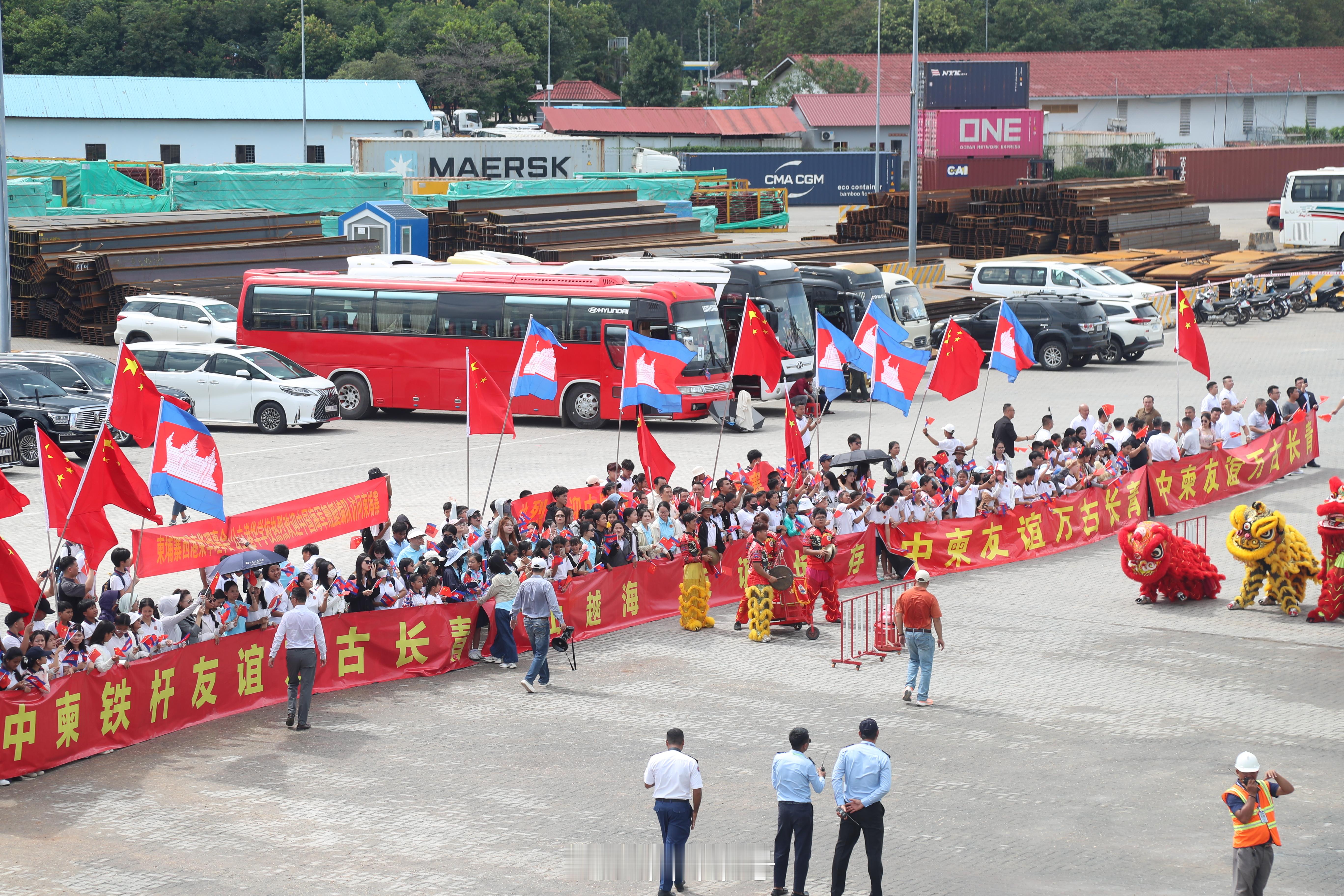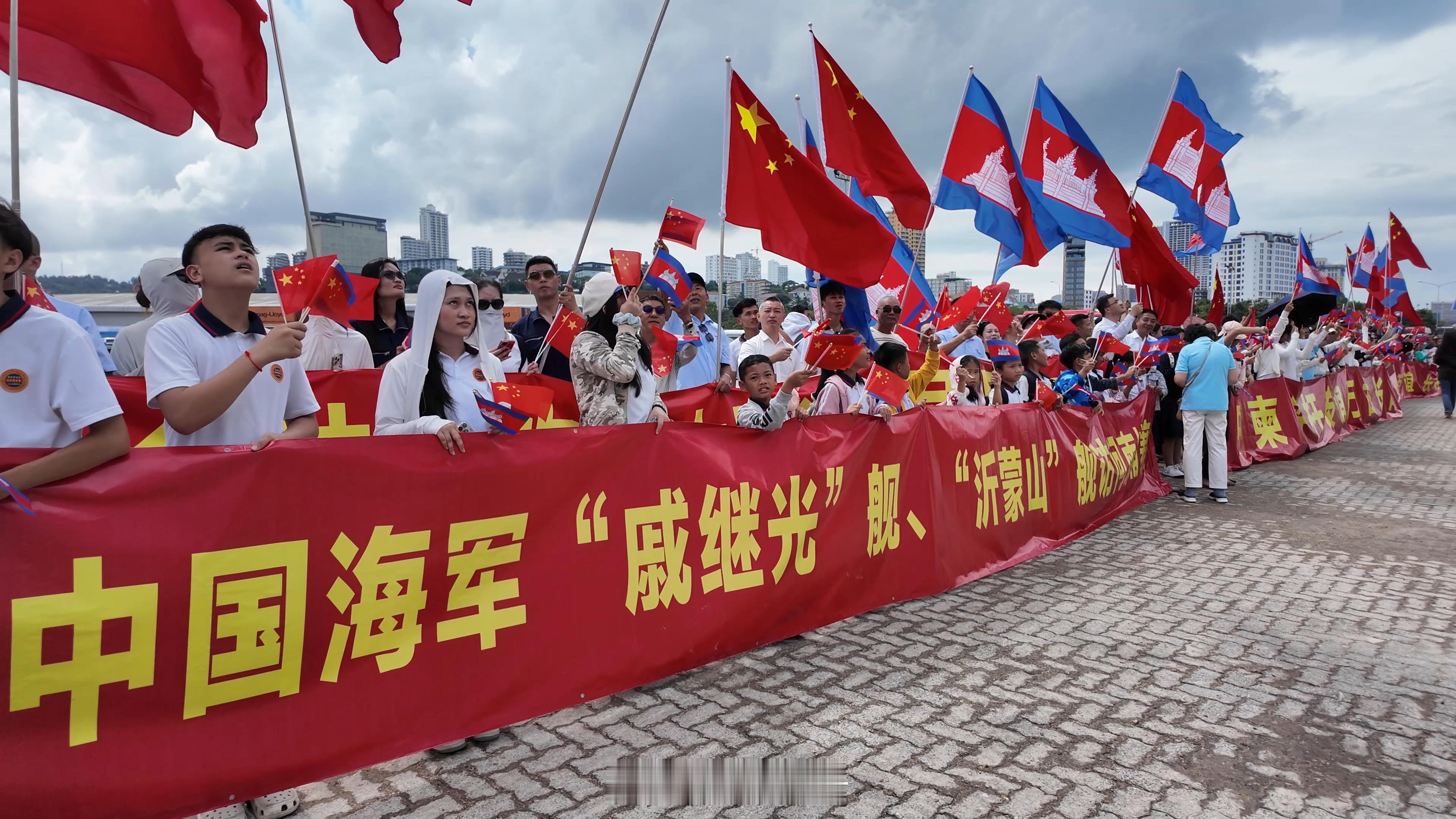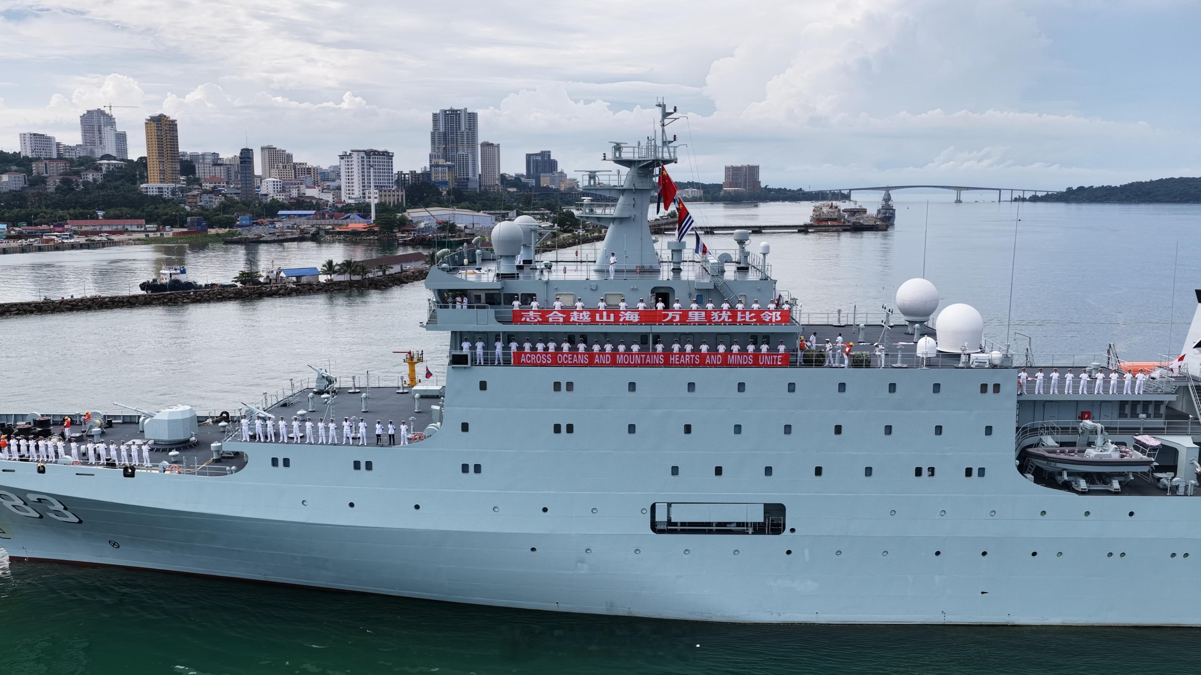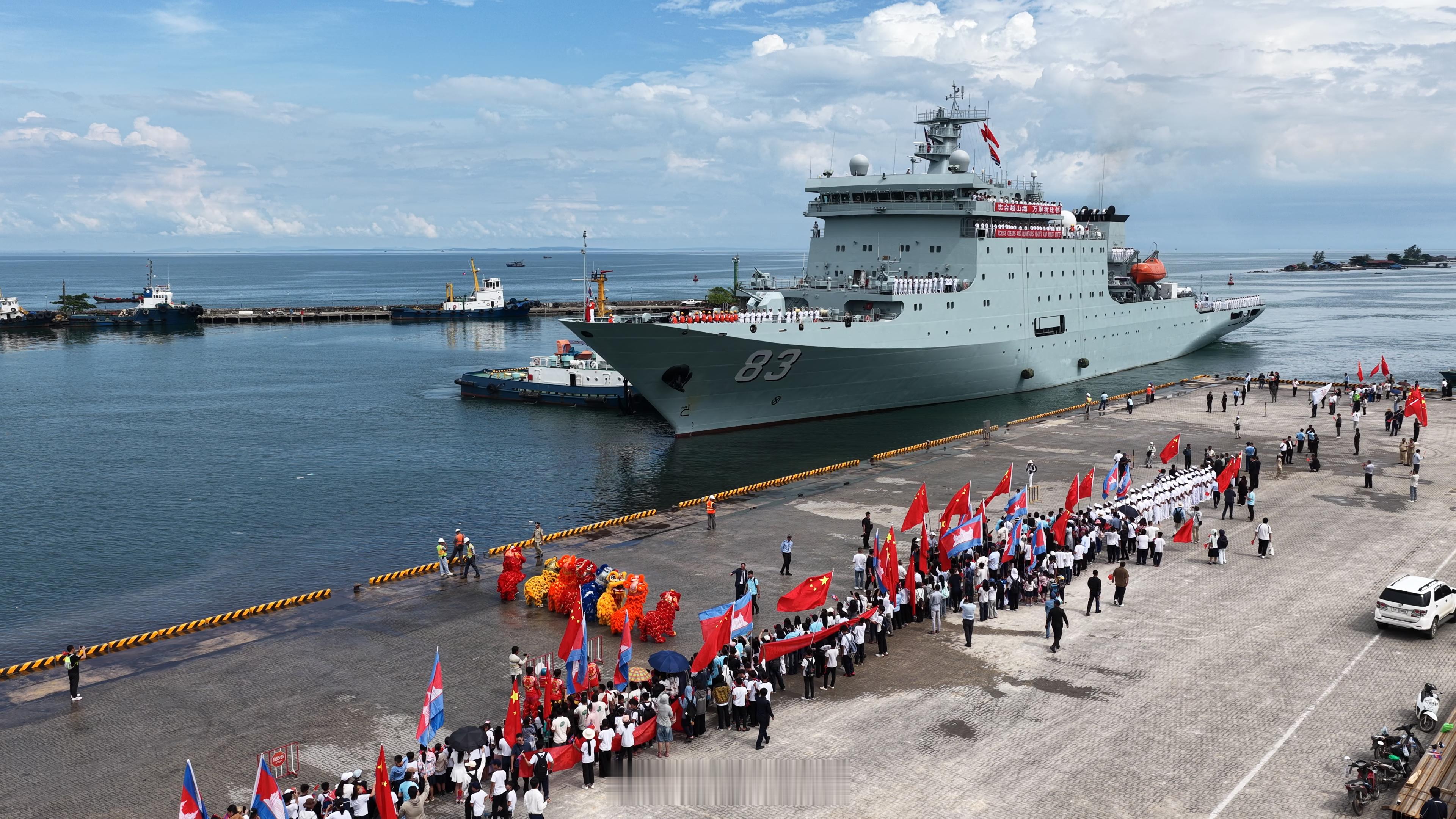 当地时间上午10时,海军戚继光舰、沂蒙山舰在热烈的欢迎声中,缓缓靠泊西哈努克港码头。官兵在甲板分区列队,向欢迎人群致意。中国驻柬埔寨使领馆工作人员,中资机构、华人华侨代表以及柬埔寨政府、军方代表等300余人到码头迎接。